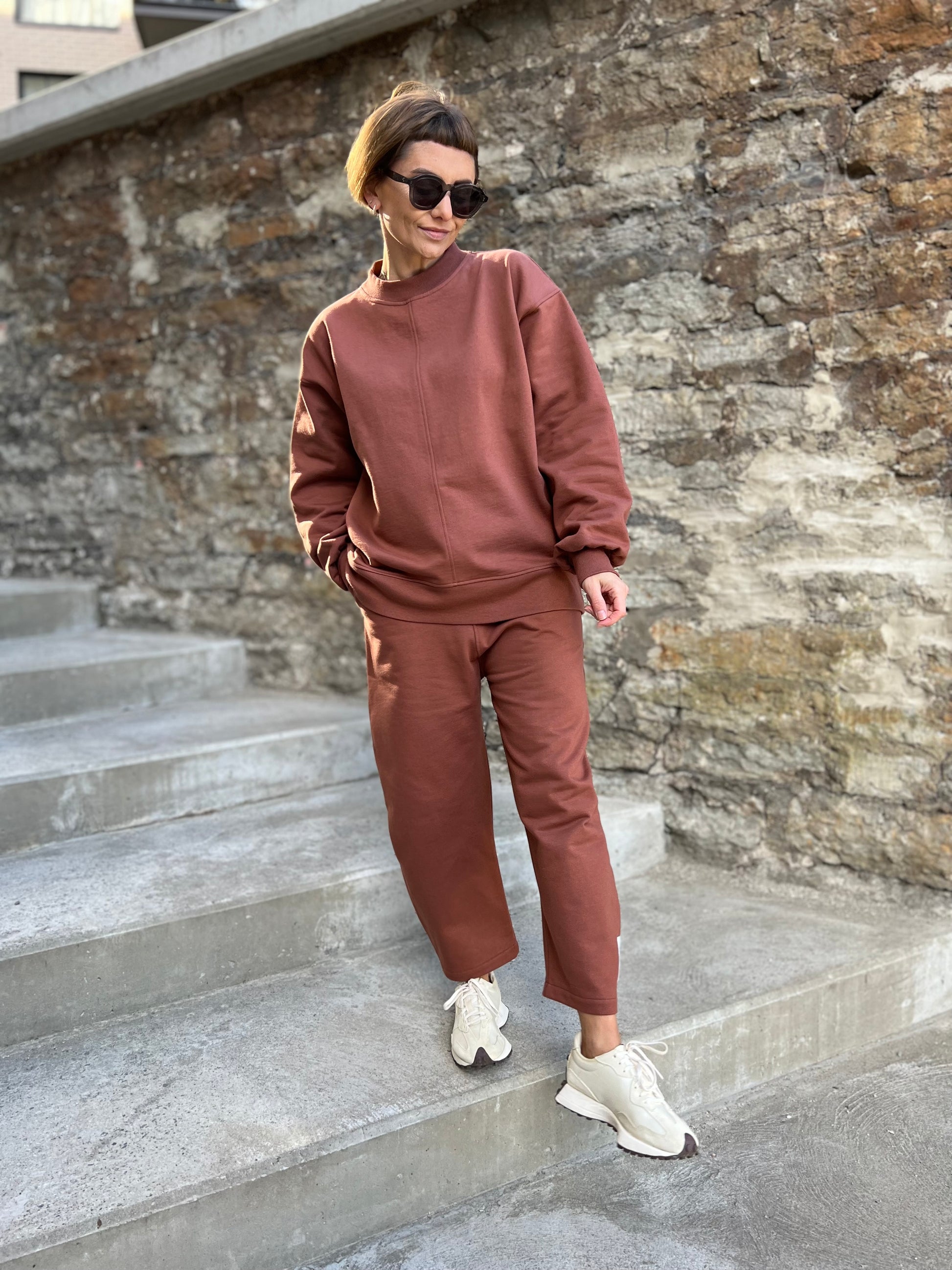 our soft sweat is GOTS certified and produced in estonia from organic cotton. it consists of 95% cotton and 5% elastane. AW2022 colors (azure, espresso, and maple syrup) consist of 100% cotton and have this slightly sturdy feel.