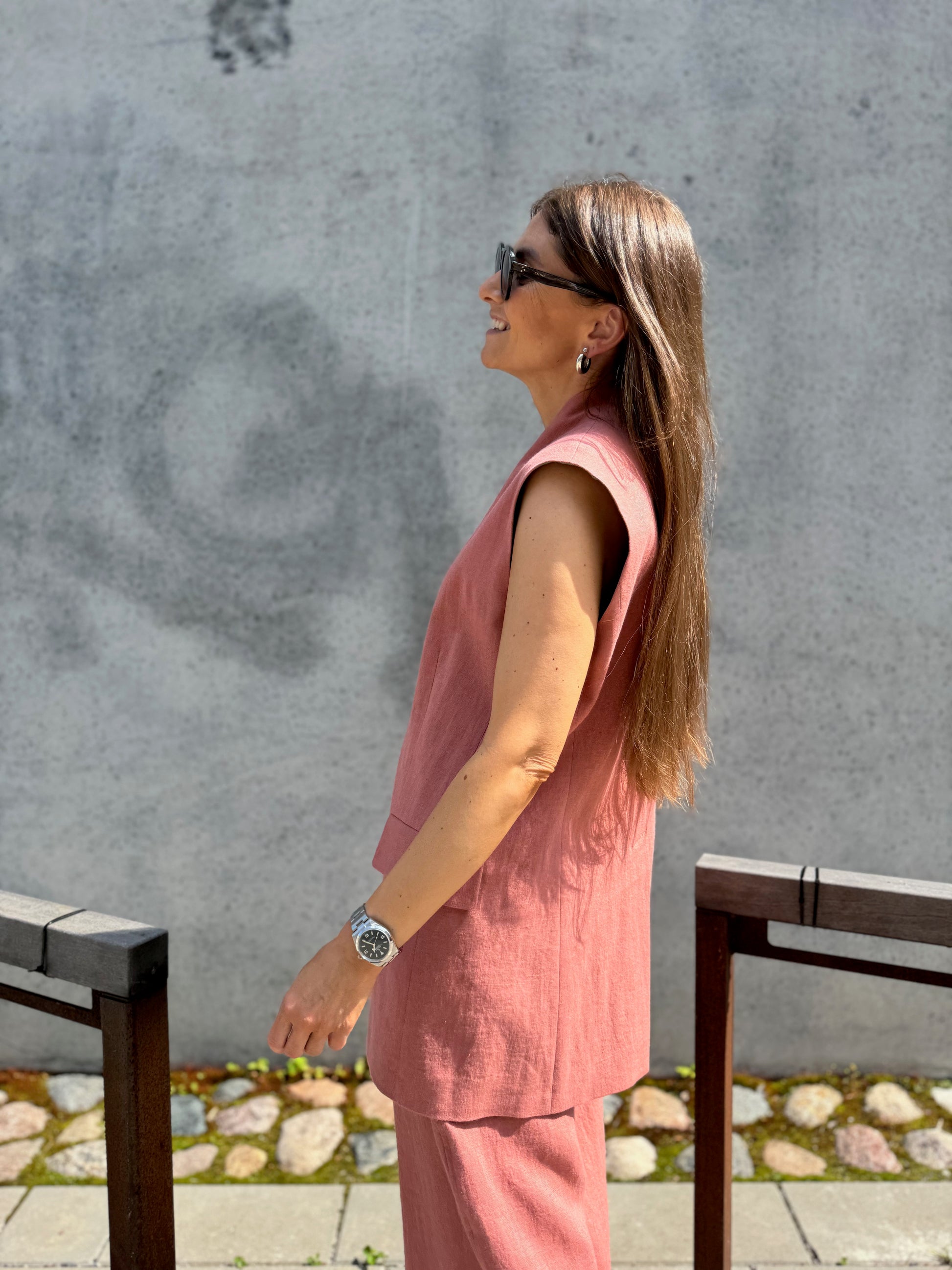our malaga waistcoat has an feminine silhouette topped with bold shoulder. it has a minimal contemporary cut with a single button closure and two side flap pockets. malaga waistcoat is minimal, effortless and quietly powerful.