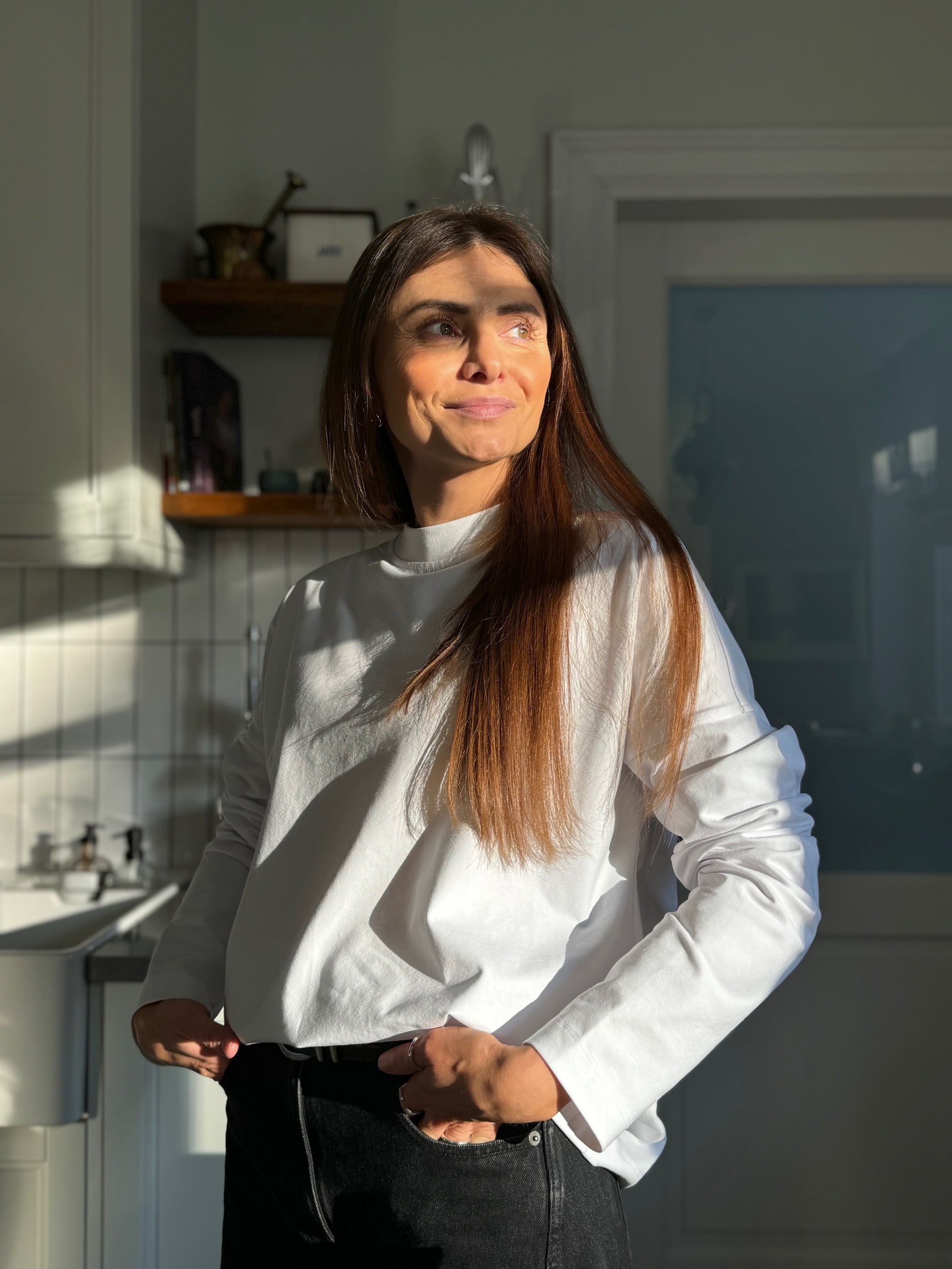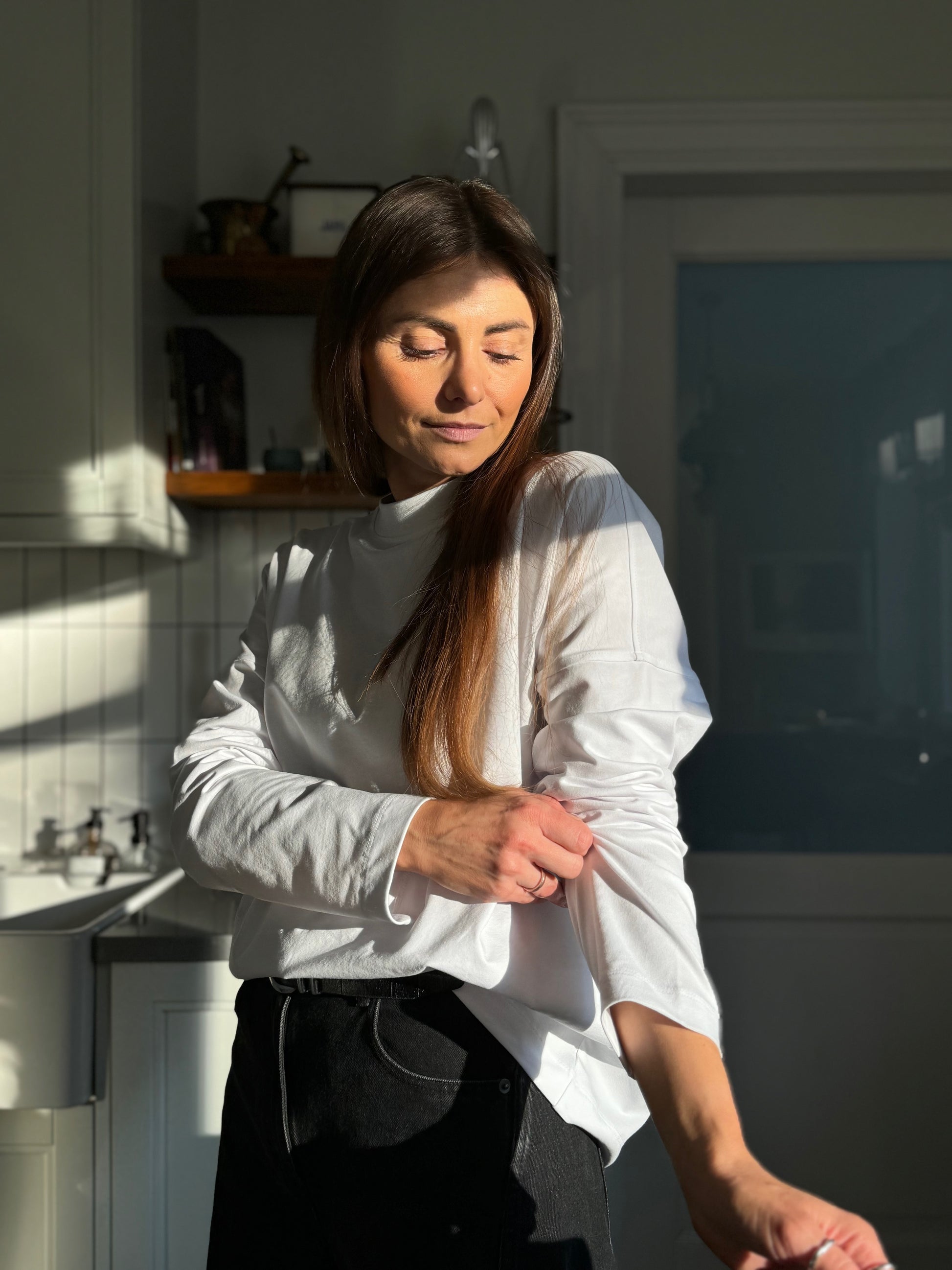 elda t-shirt is the most fitted one from our t-shirts selection. it’s still roomy and great on it’s own but works well as a base layer too. featuring mock-neck collar and extra long sleeves for layering game.
