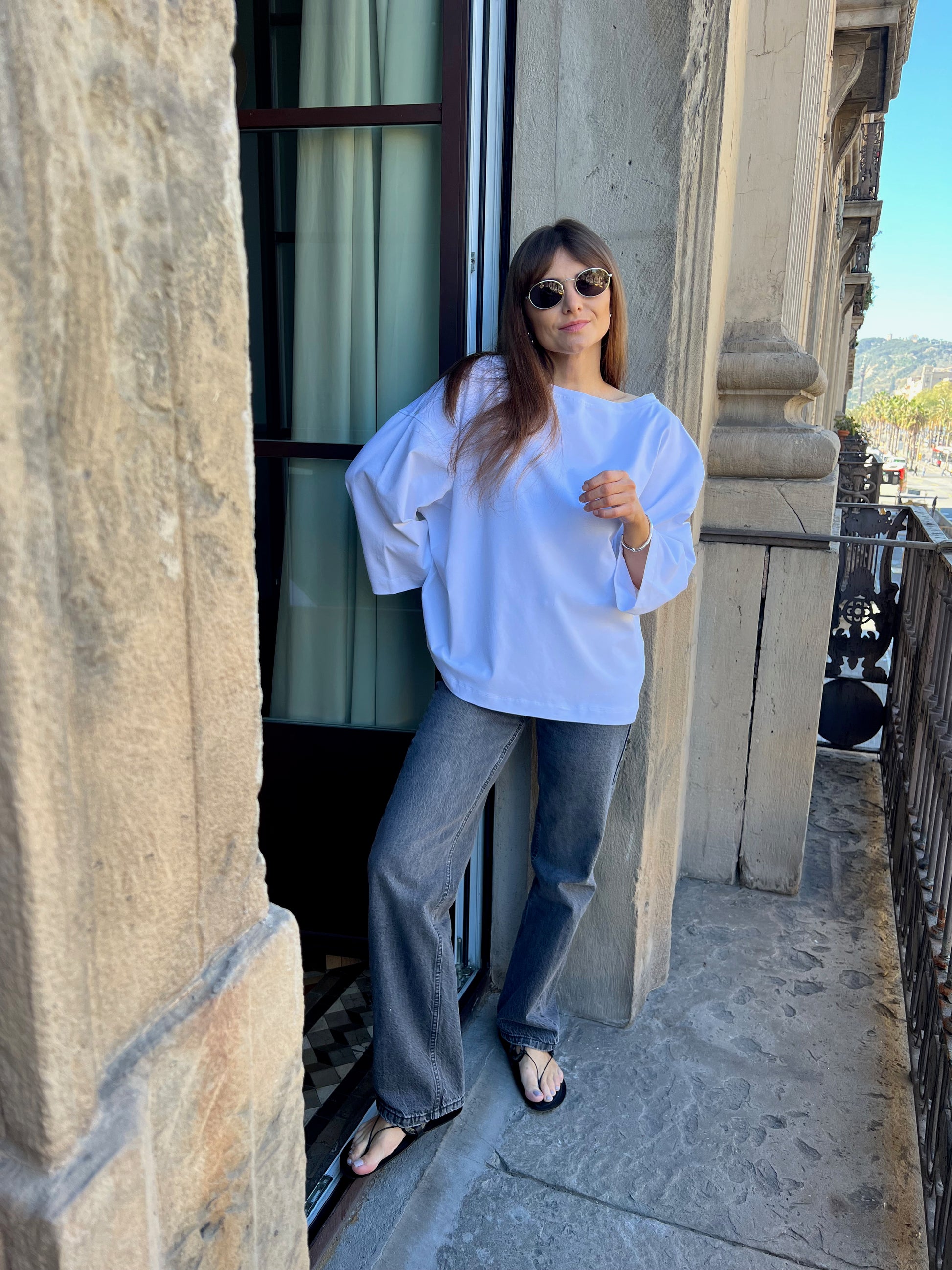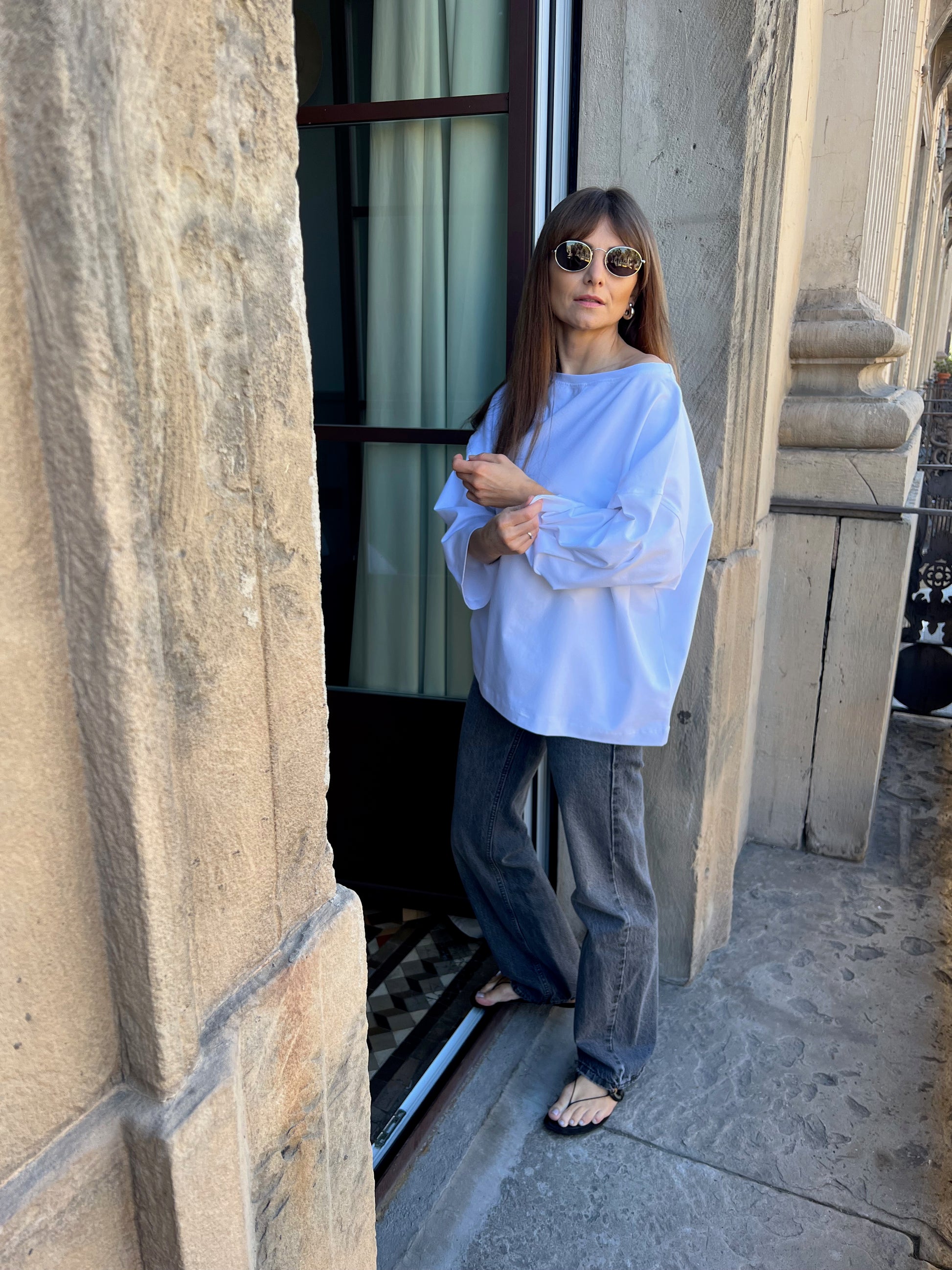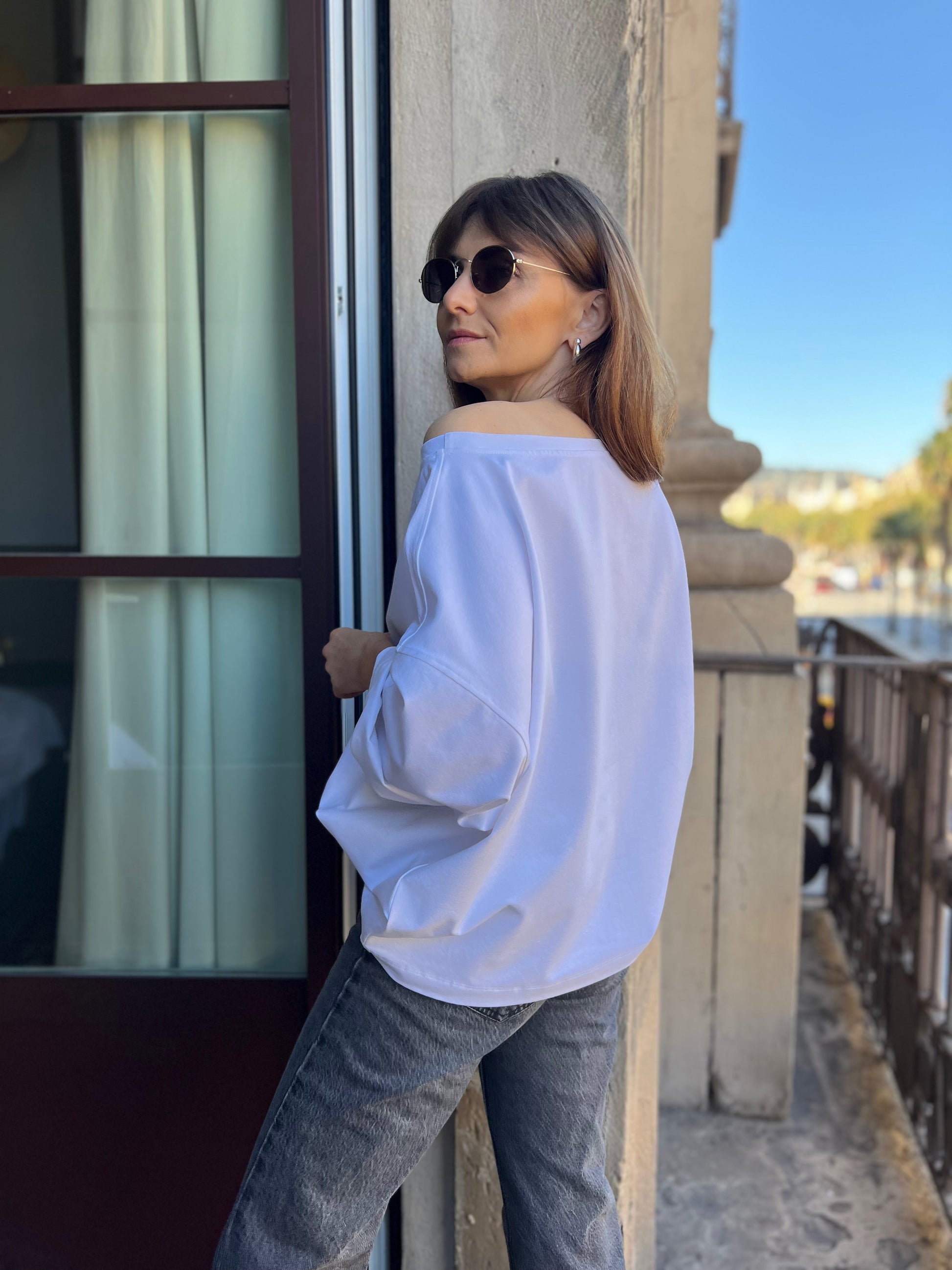goa is a deliberately oversized long sleeved jersey top. it has a flattering boat neck cut that allows it to be worn also off-shoulder. roll up the sleeves for more effortless look.
