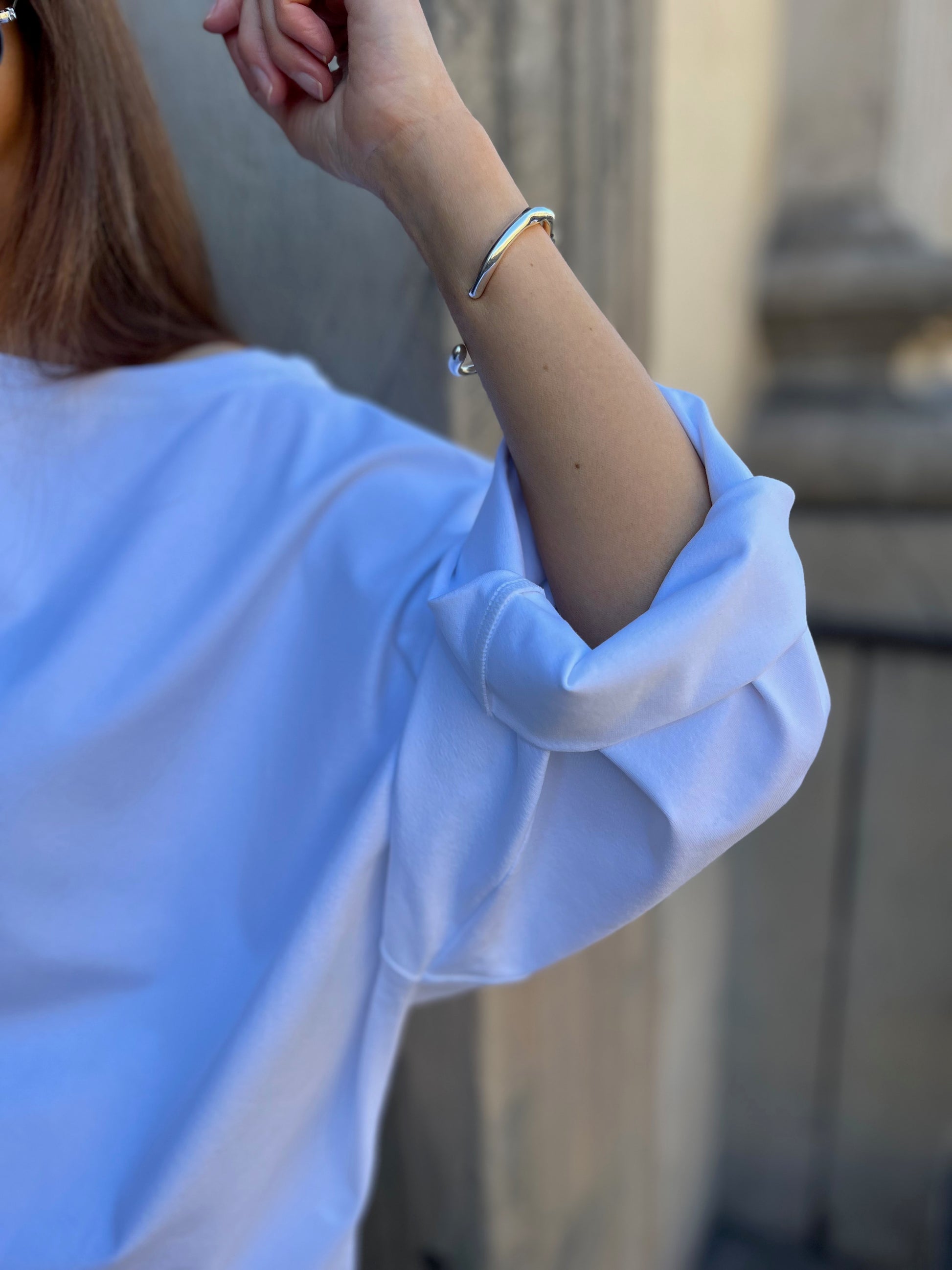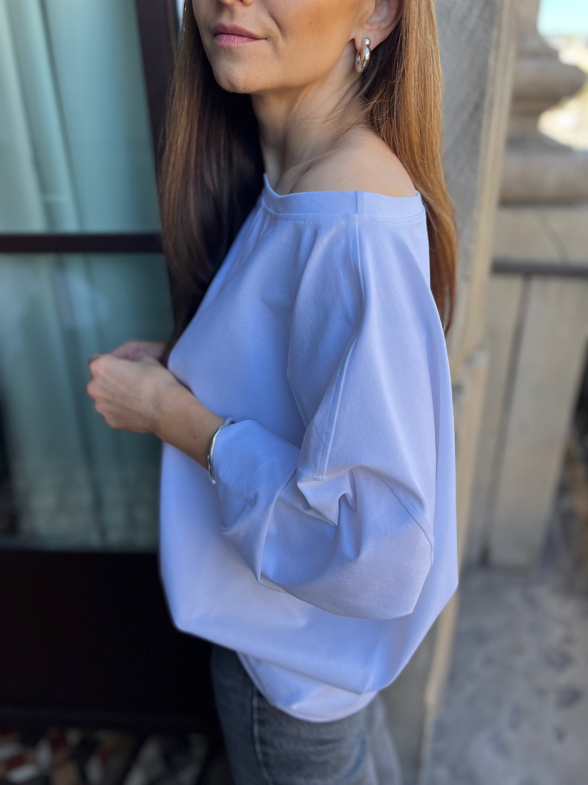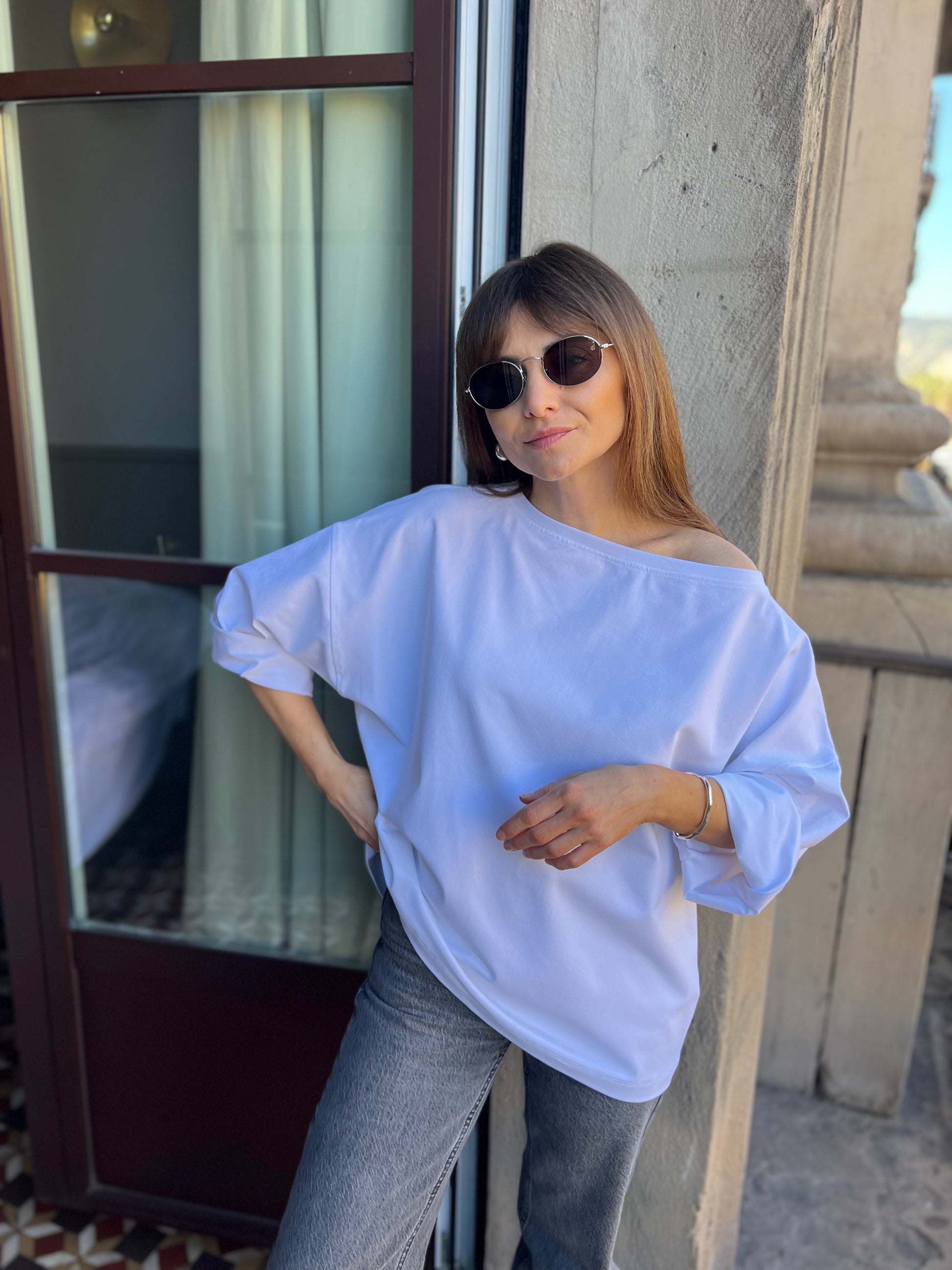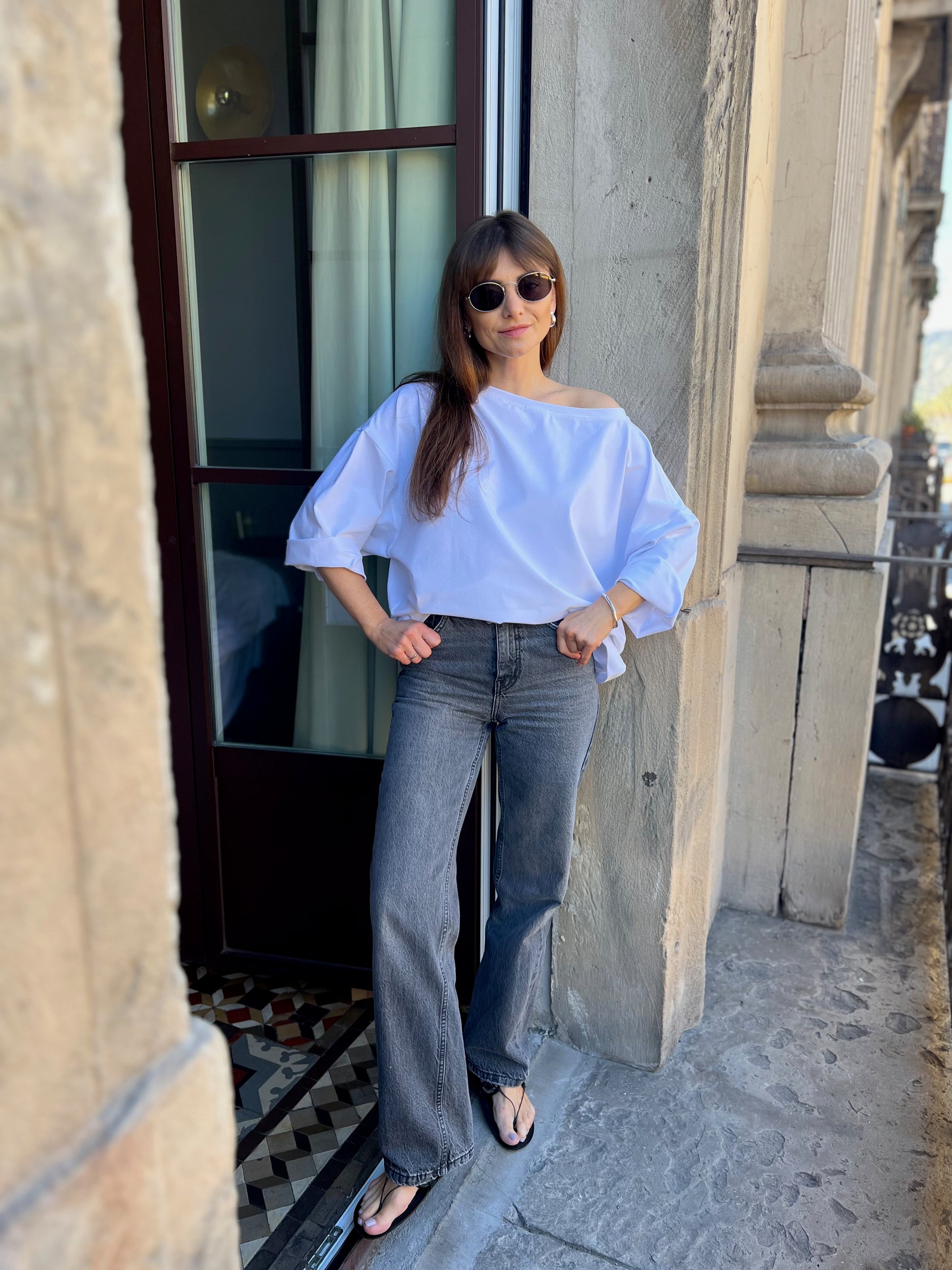 goa is a deliberately oversized long sleeved jersey top. it has a flattering boat neck cut that allows it to be worn also off-shoulder. roll up the sleeves for more effortless look.