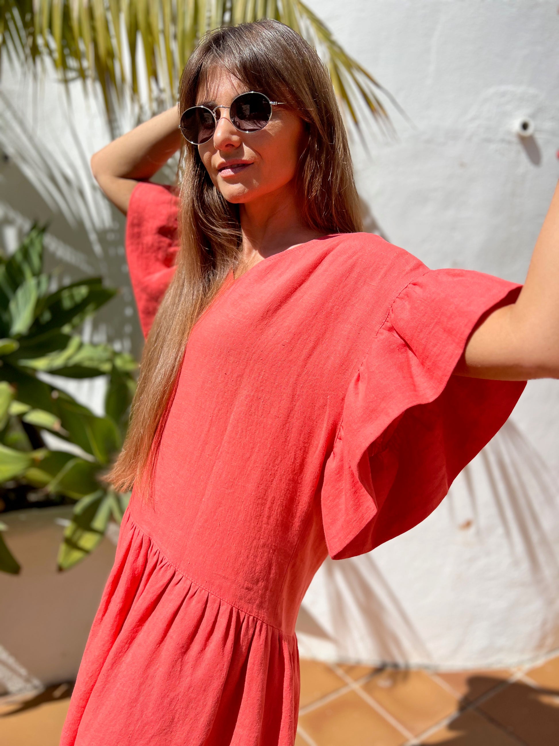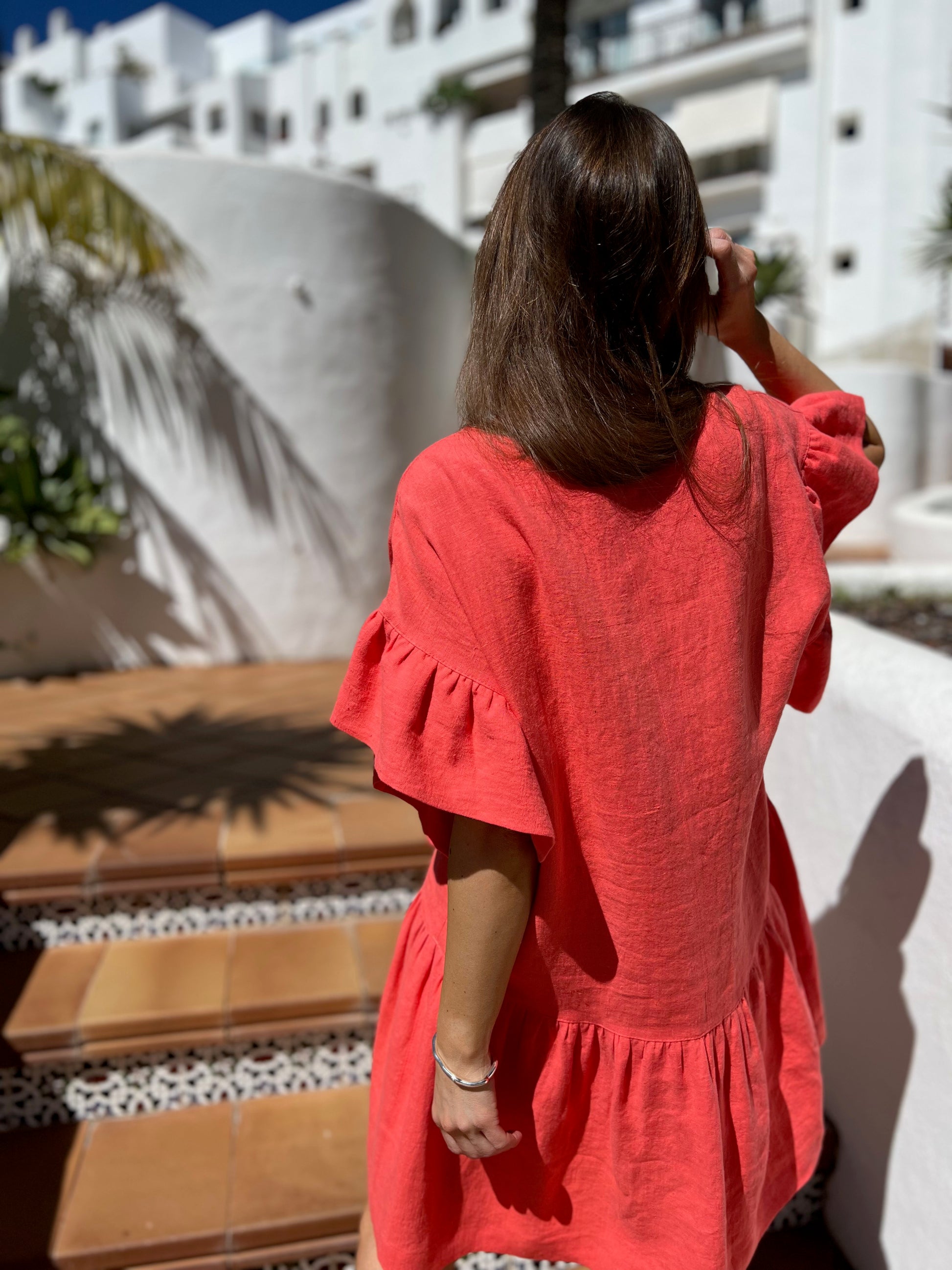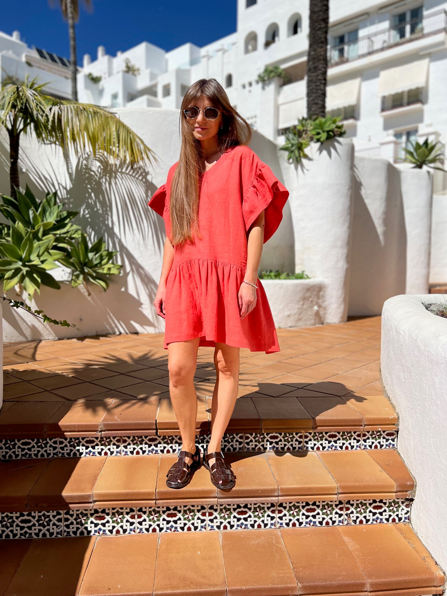 palma dress is your ultimate summer dress. it has bold frilled sleeves and skirt to balance the boxy silhouette of its body, plus a soft V neckline. its versatile silhouette will take you equally prettily through beach days and summer parties.