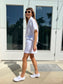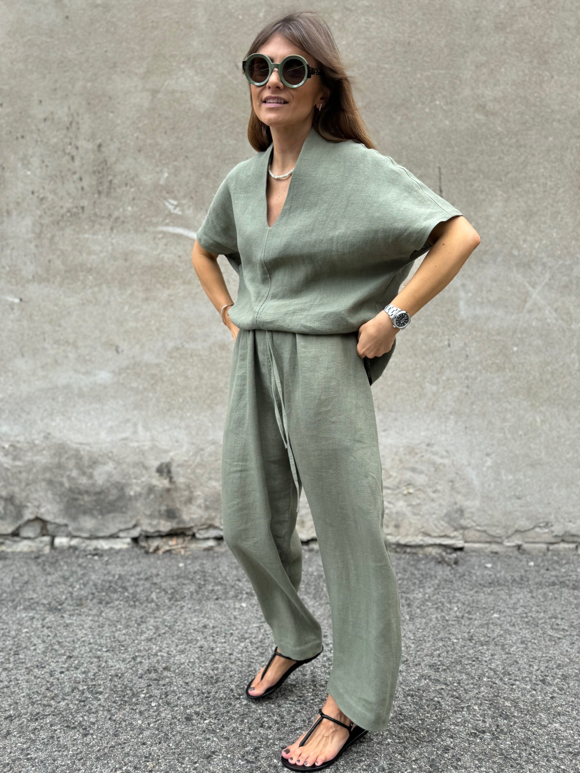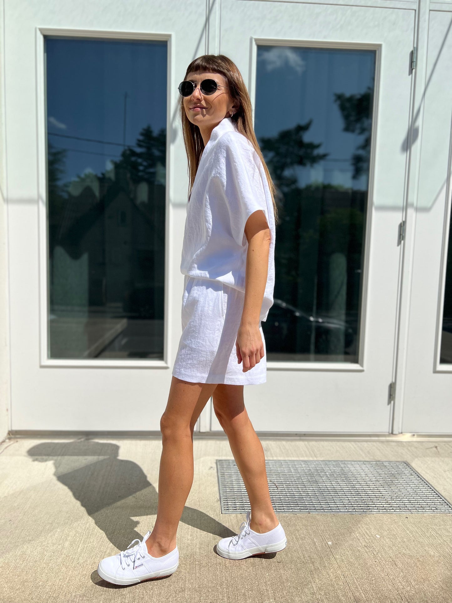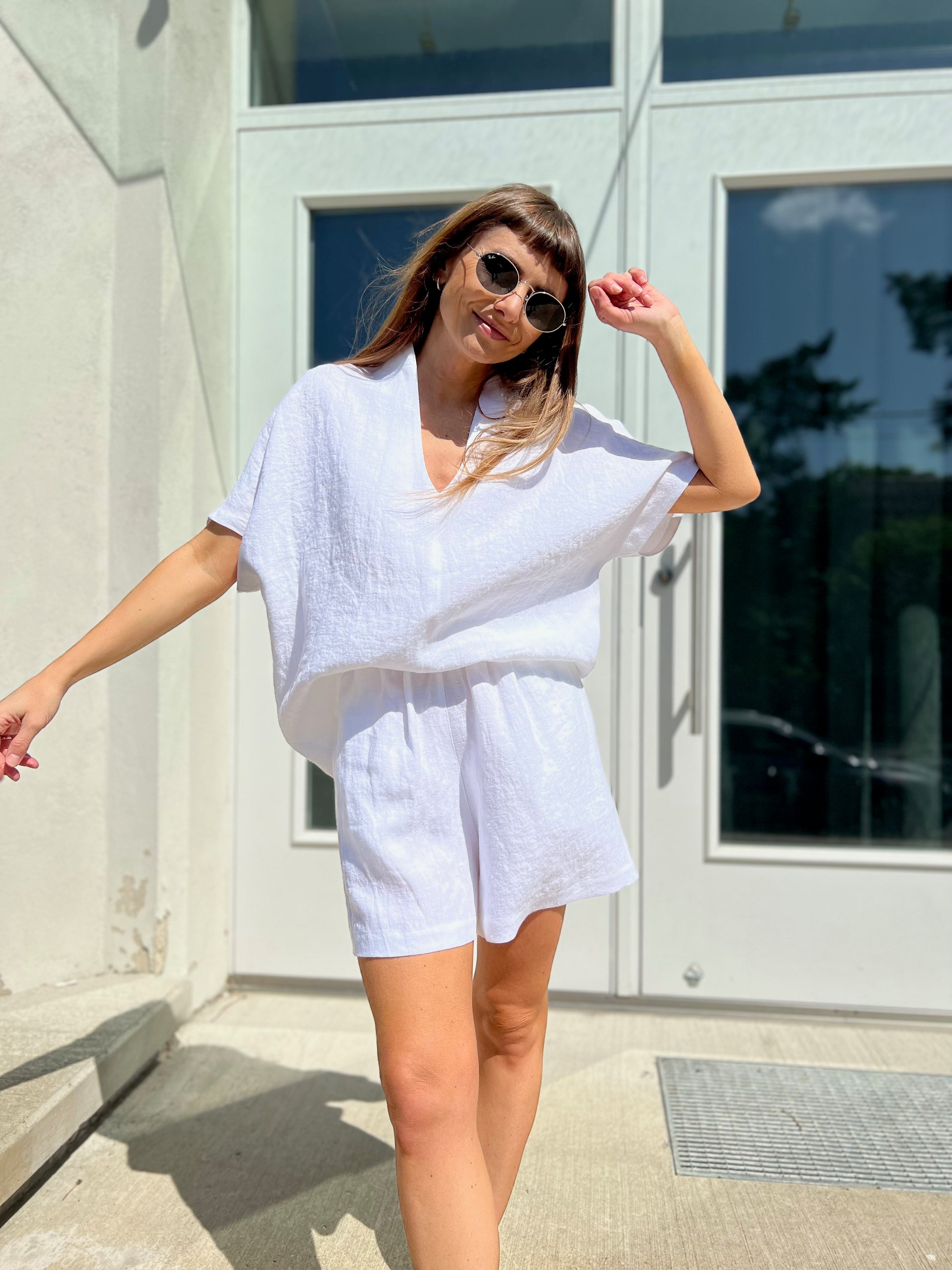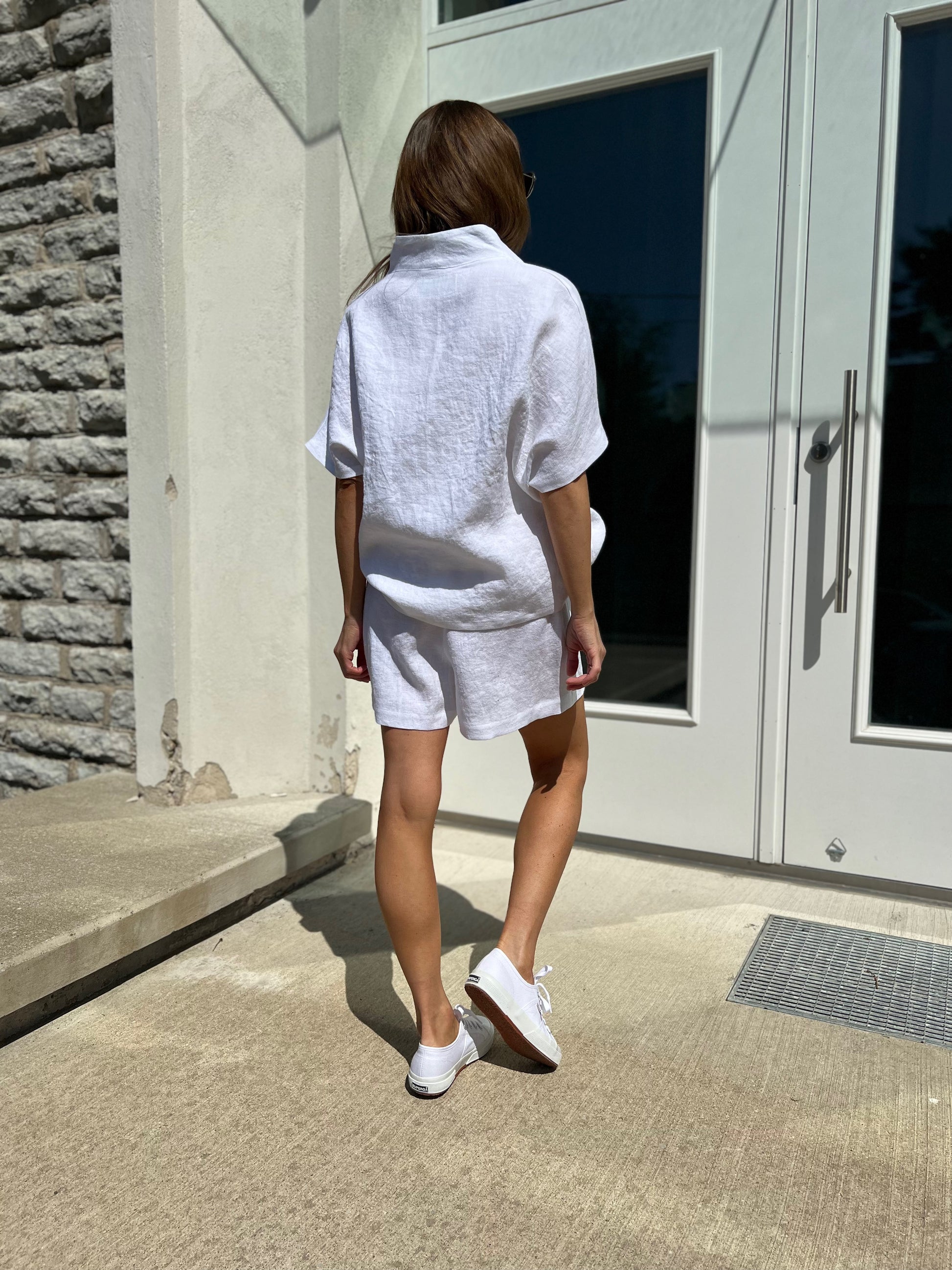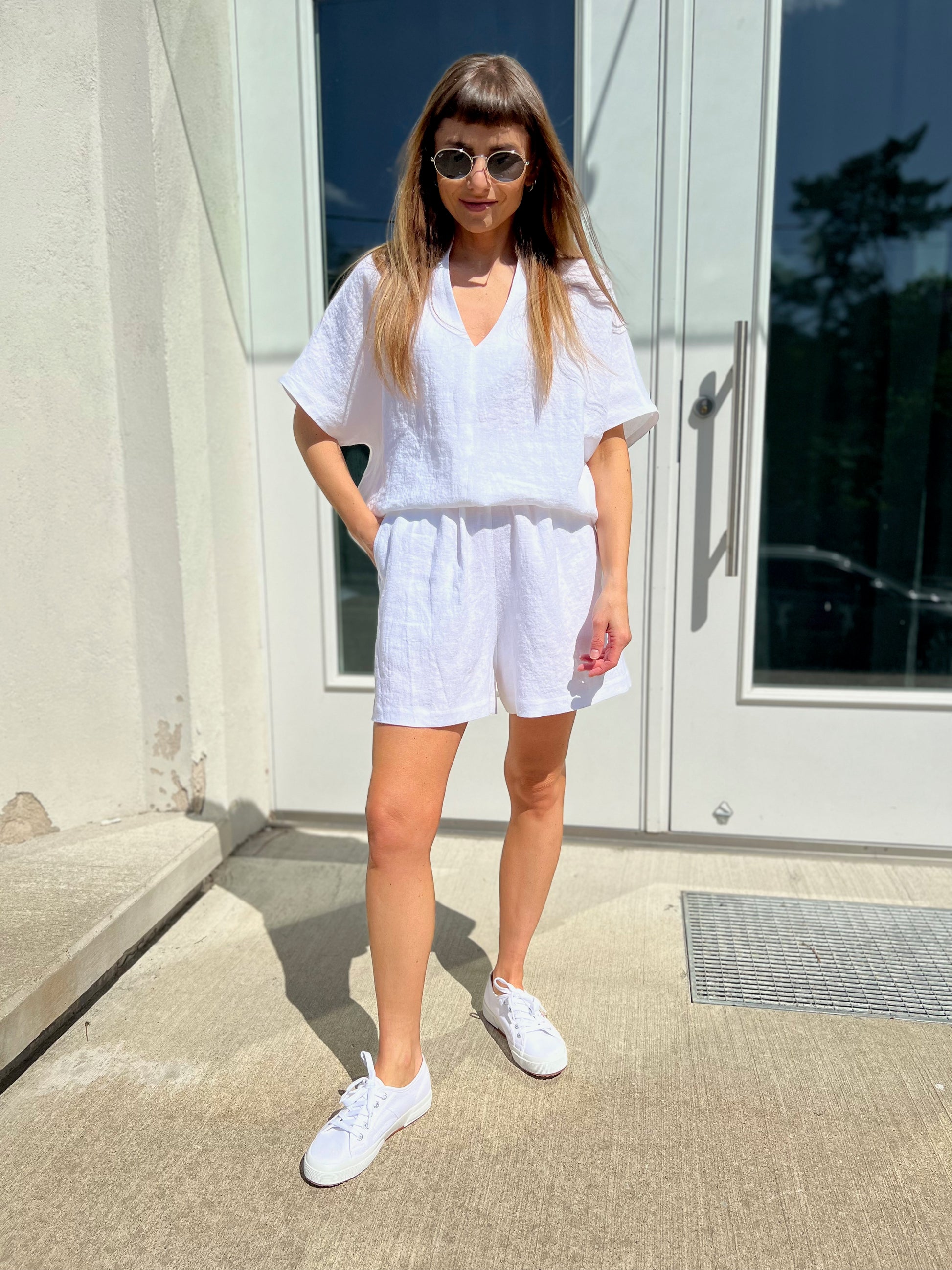 saint-tropez is a linen short sleeve blouse with deep V neckline. combination of its chic design and washed linen fabric will take you through summer days with effortless elegance.