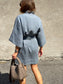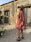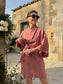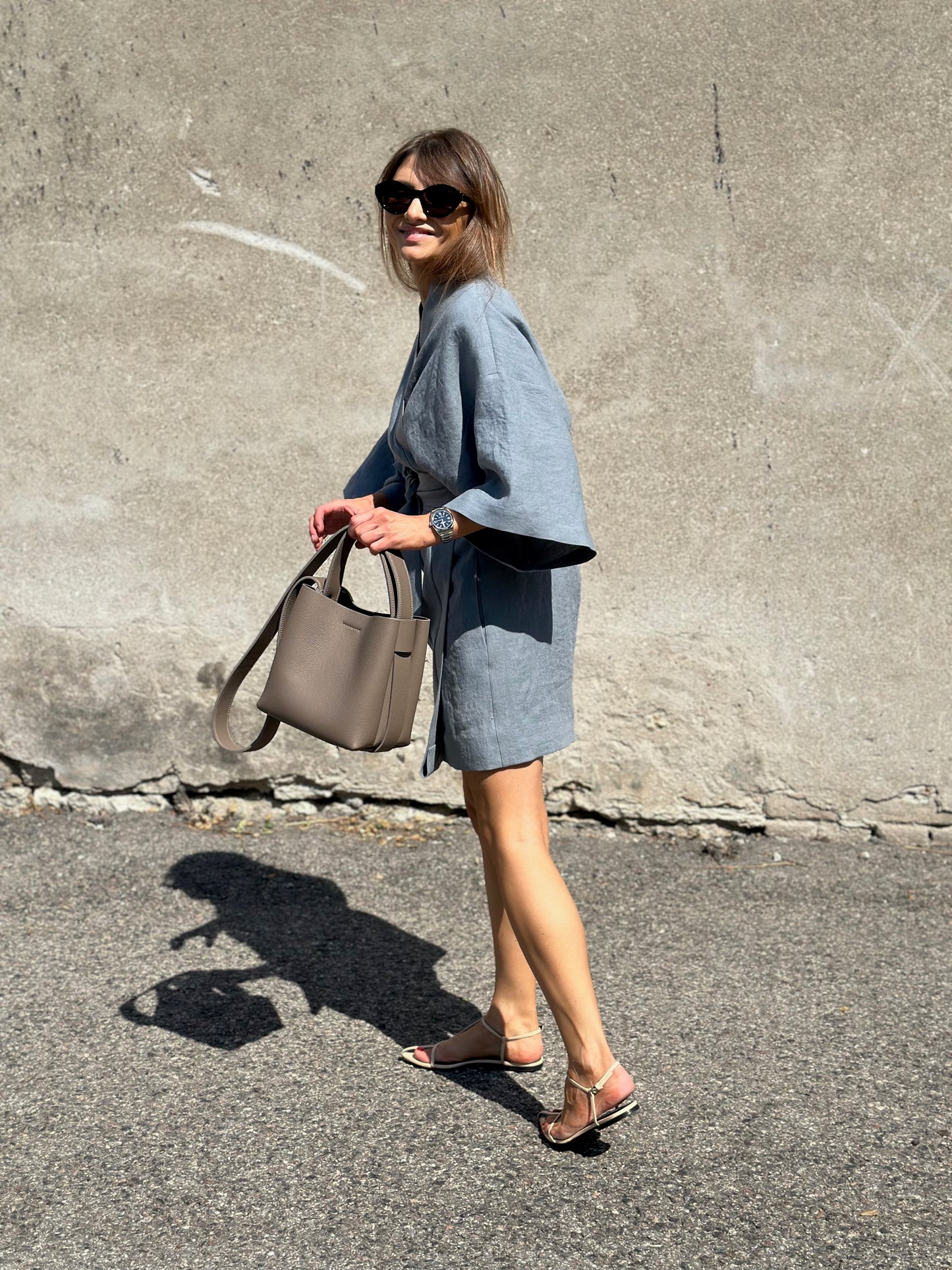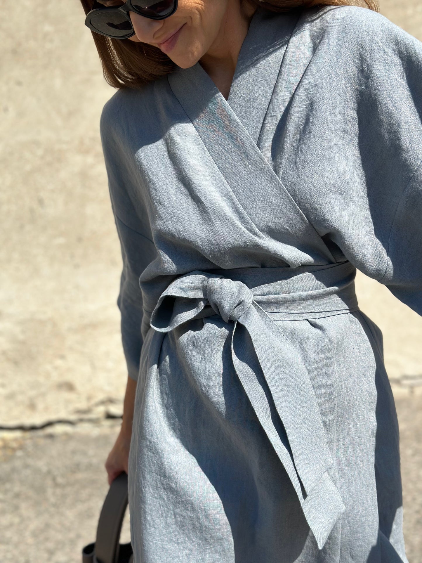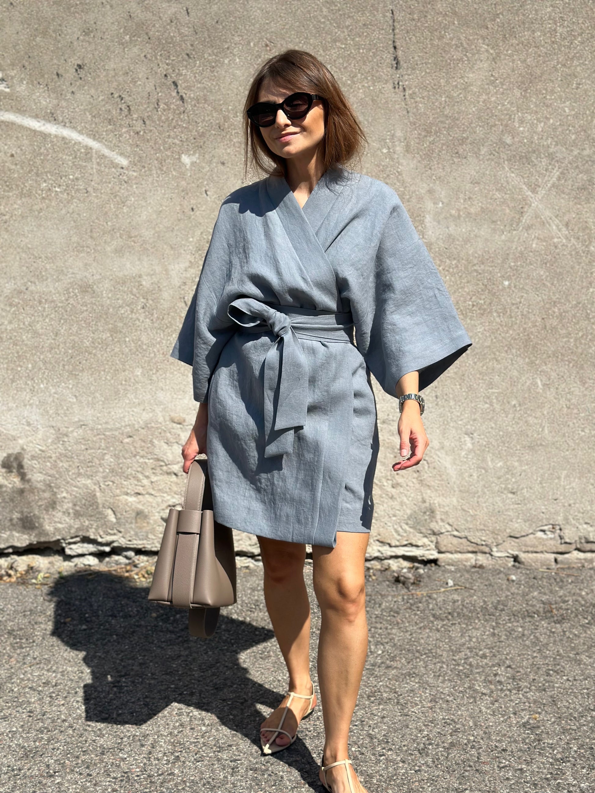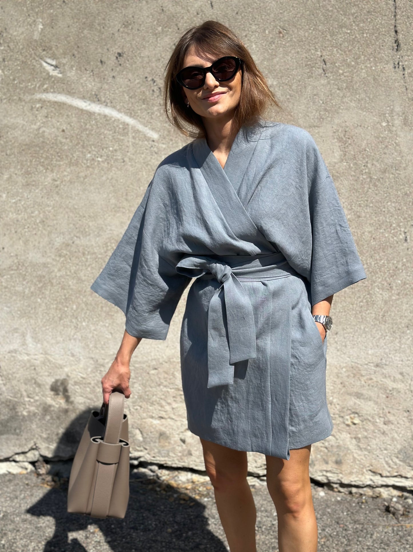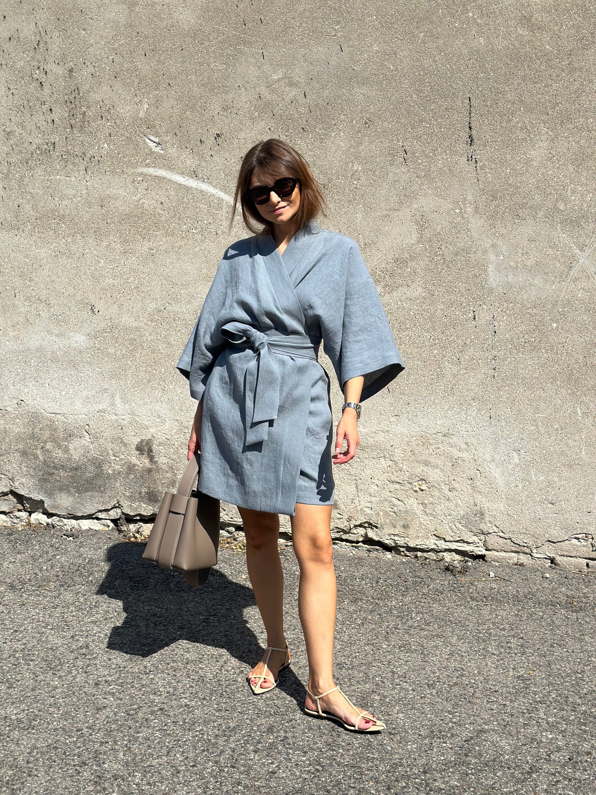 it has all the same elements but in a lighter fabric: silhouette inspired by traditional japanese garment kimono, oversized boxy sleeves and generous body that you can alter by gathering it to your own liking. it’s actually even more than a dress – you can wear it as a light coat too. pockets in side seams.