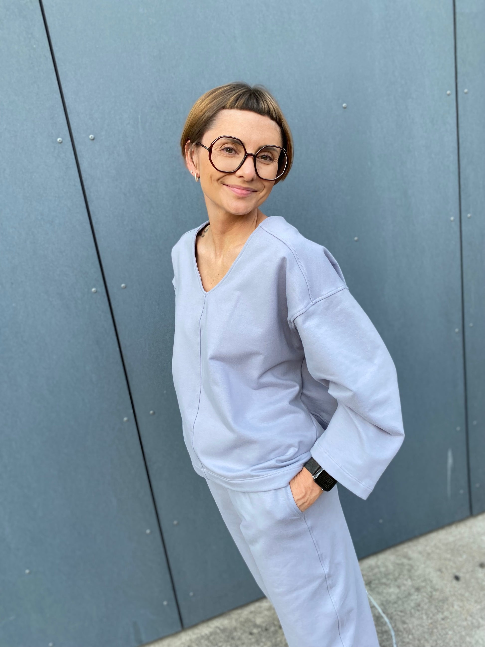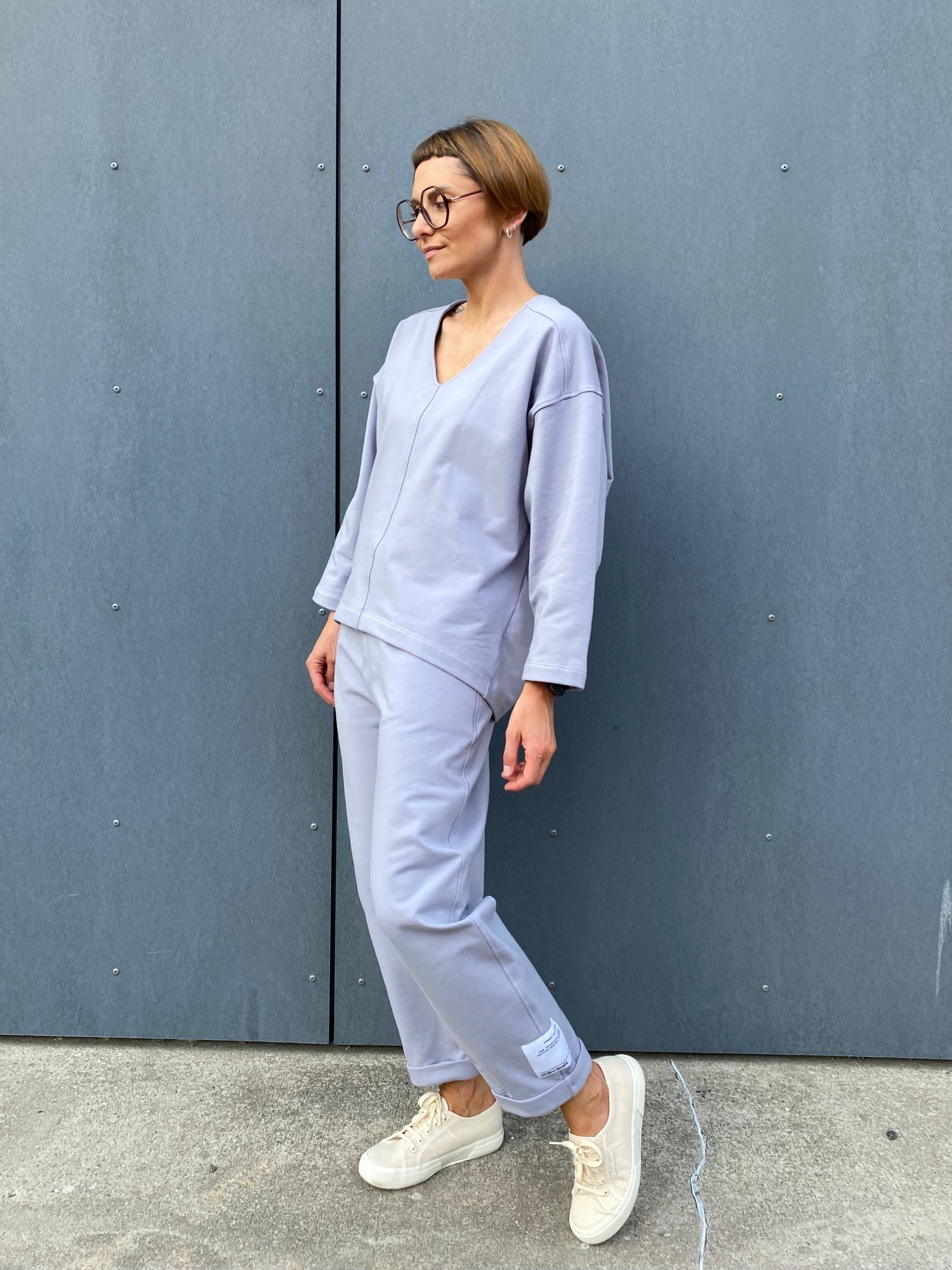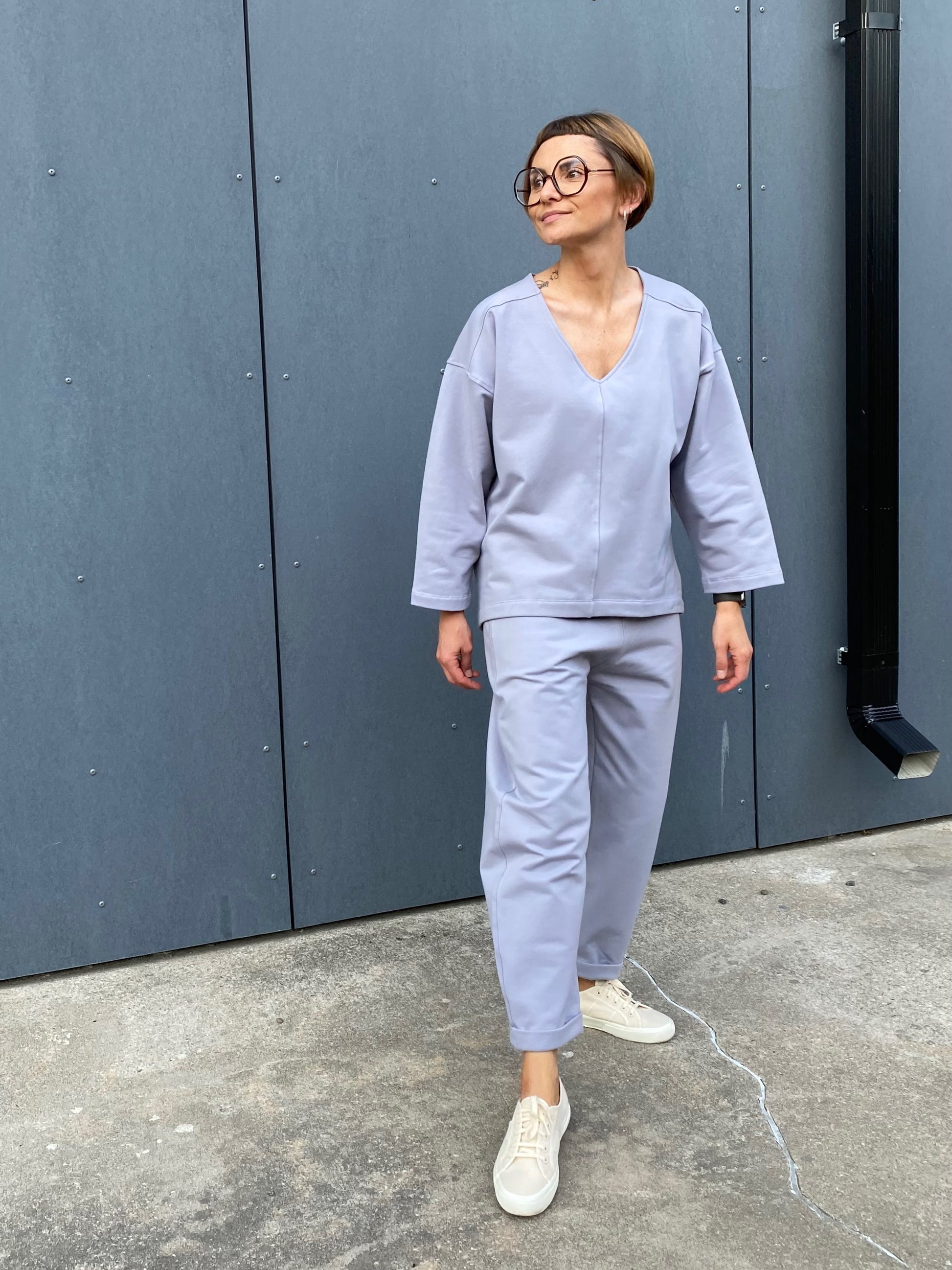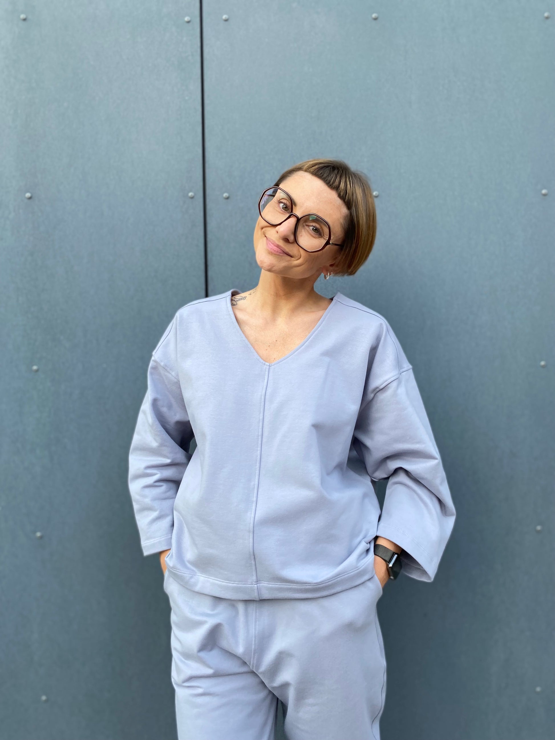 paris sweatshirt is a hybrid between a cosy sweatshirt and sophisticated top. it has soft V neckline, a bit curved 3/4 sleeves and curved back that is slightly longer than front.