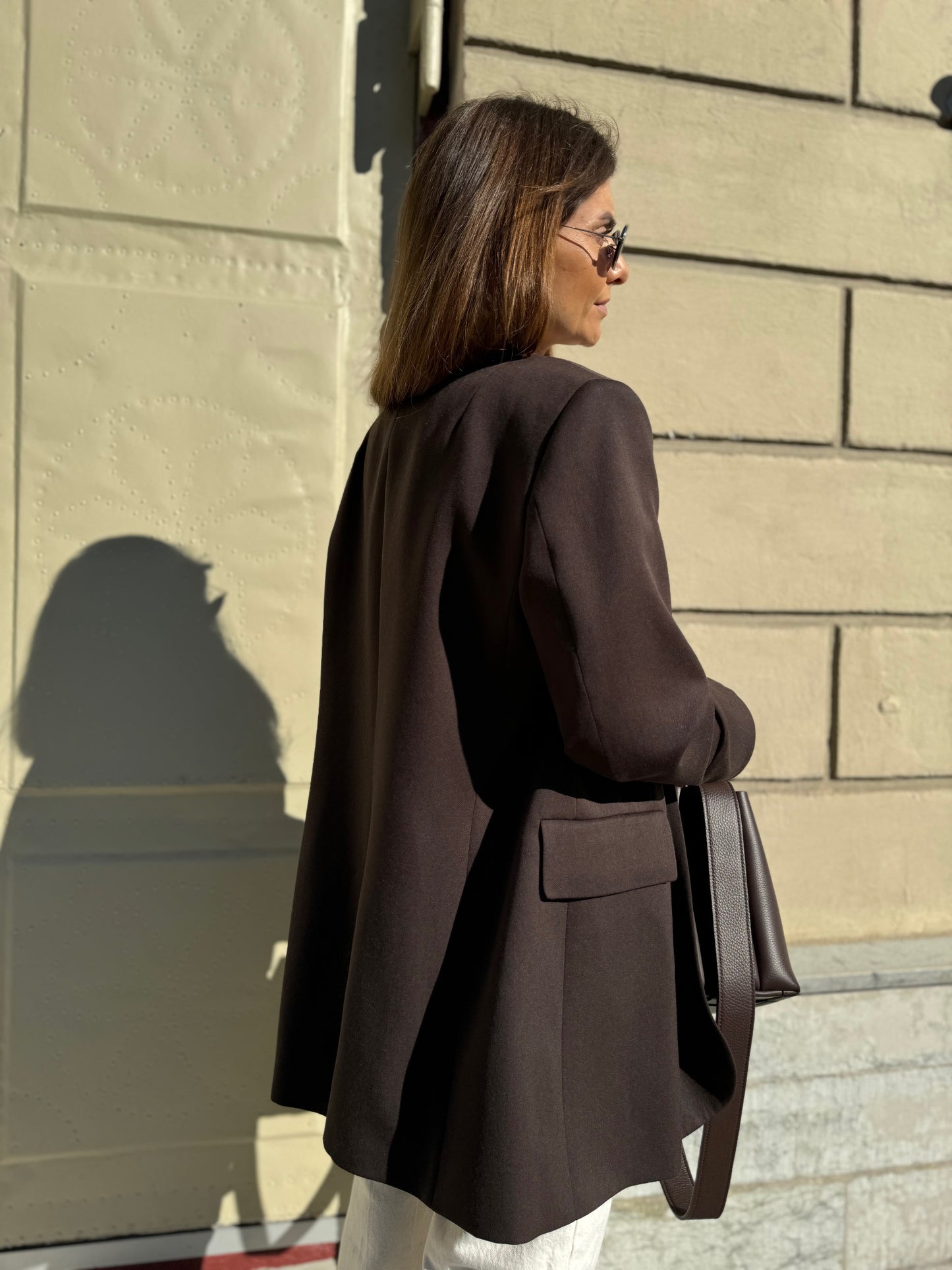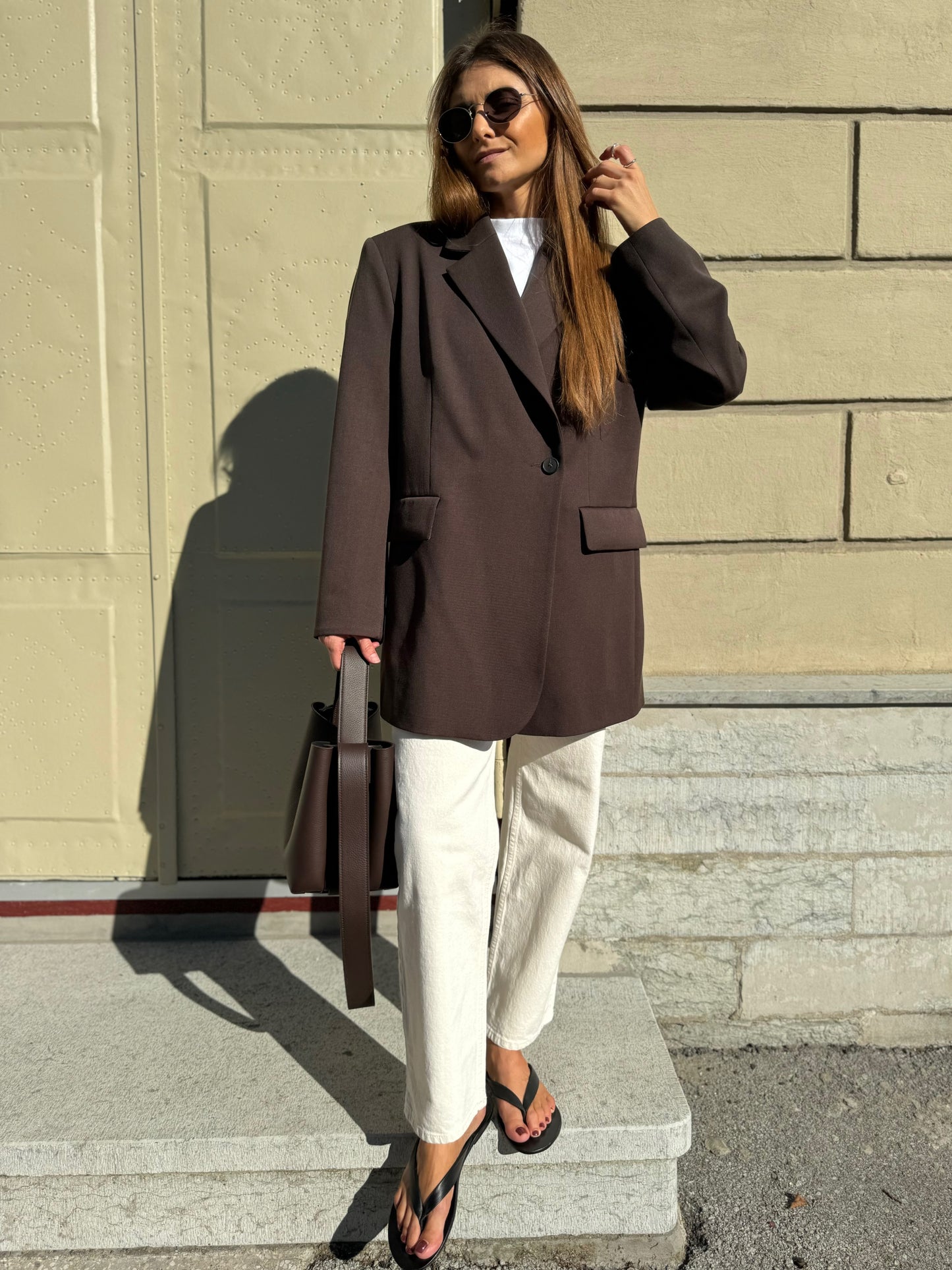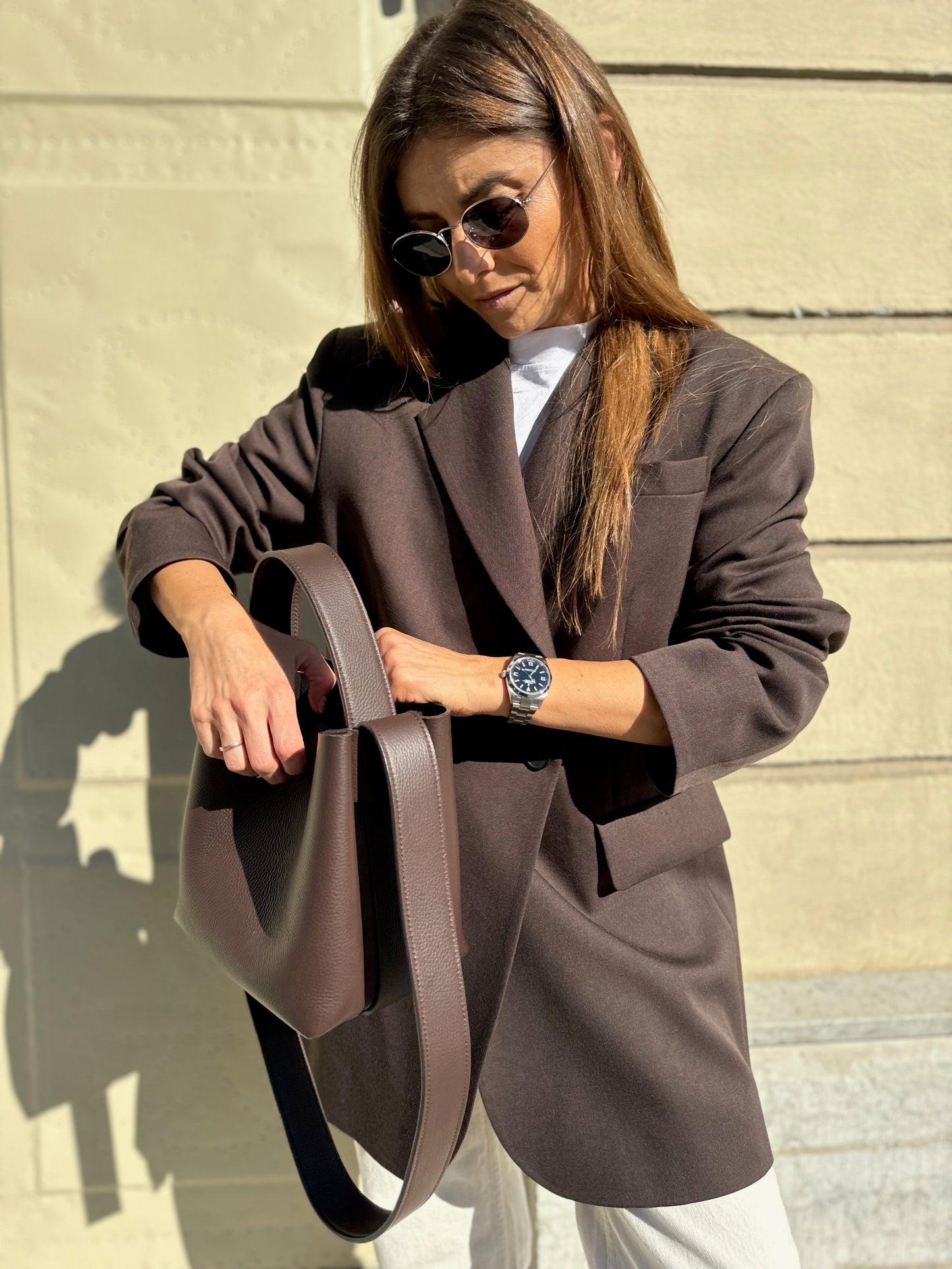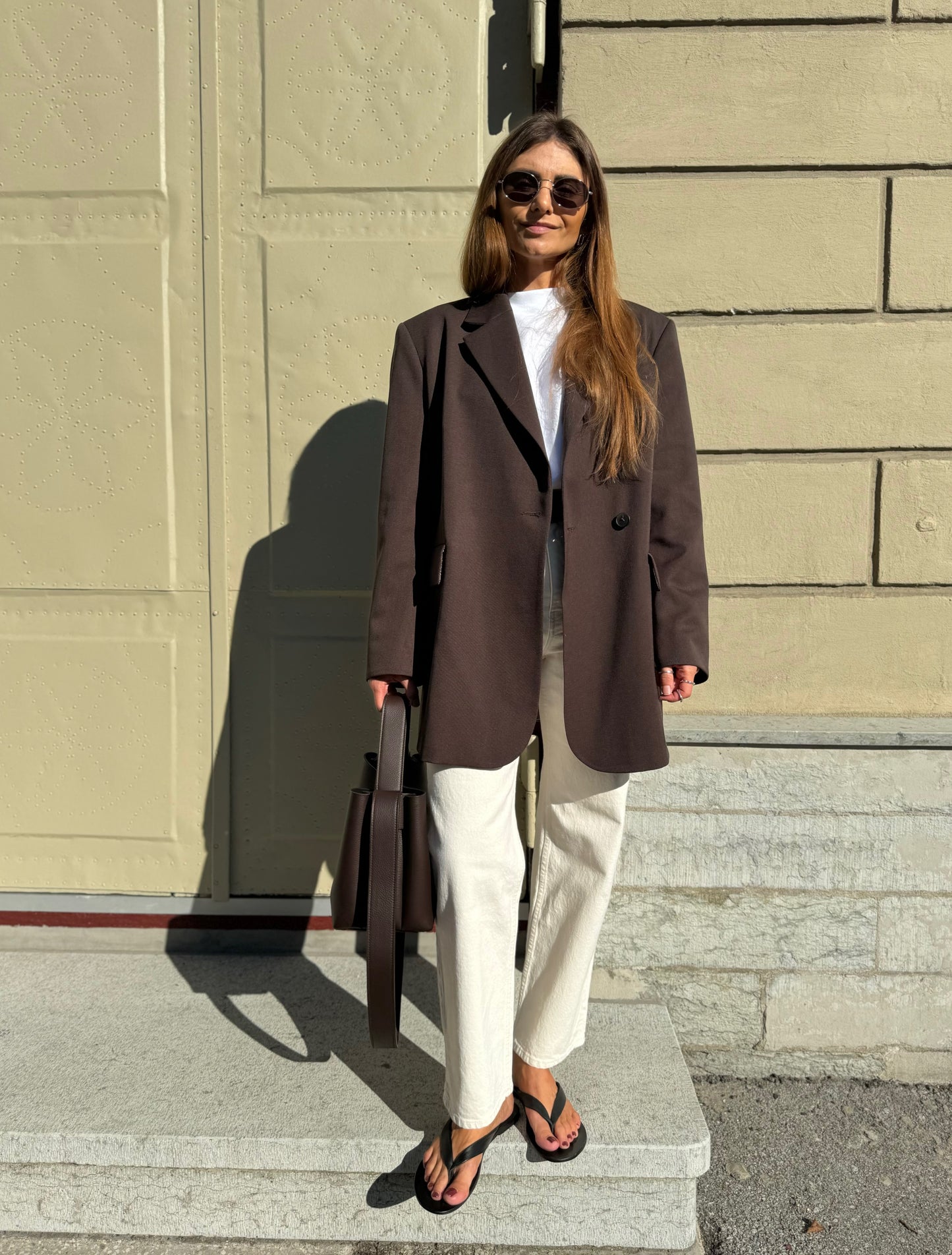 our milan blazer has an oversized silhouette topped with bold shoulder. inspired by menswear, its masculine cut is a perfect addition to feminine bottom layers. wear it as it is or create more feminine silhouette with the optional belt. size down for a regular fit.