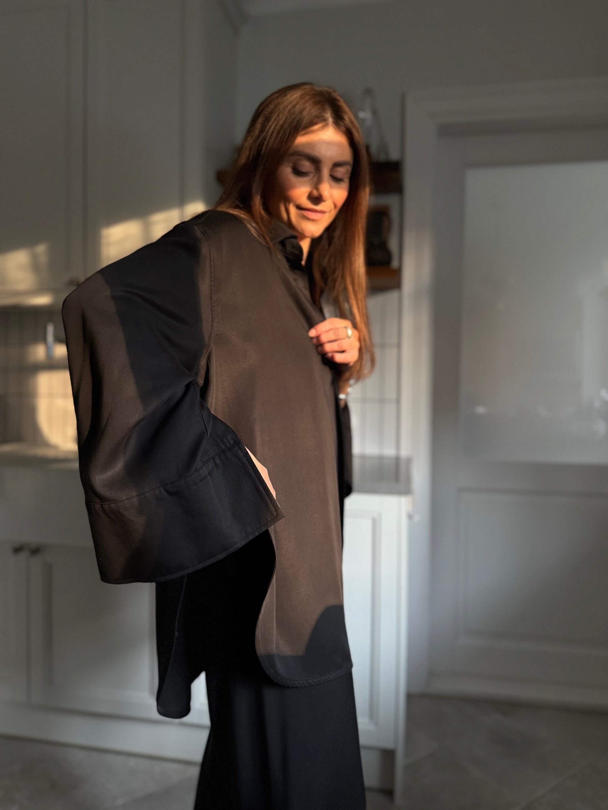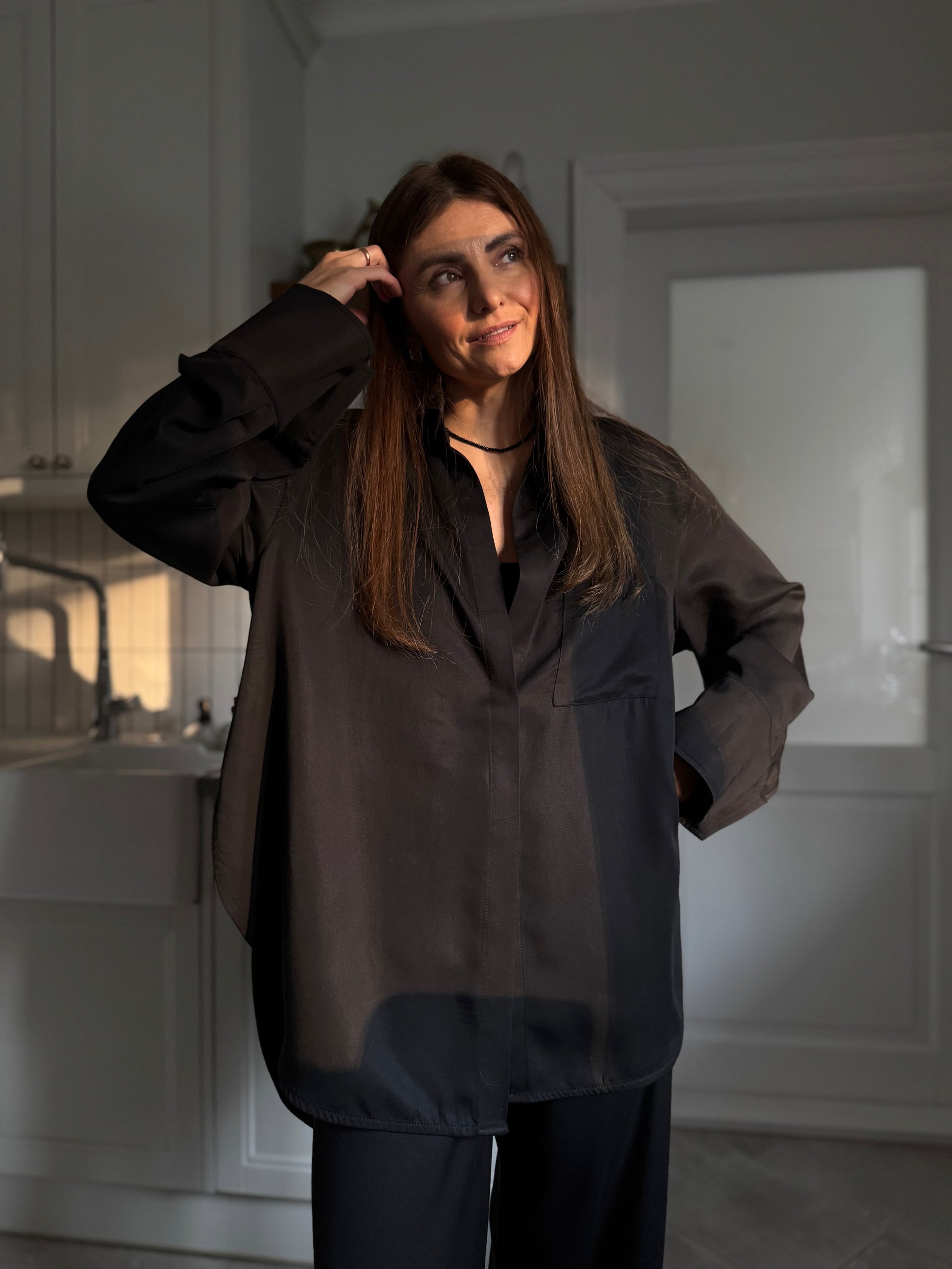 alba satin lyocell button down has a classic collar and oversized cut offering a relaxed look. long sleeves finished with wide cuffs add some modern touch. button front fastening and long slits on the sides for more wearing options. comes with a triangle scarf for even more ways to wear. a true wardrobe hero. cut in black satin lyocell which with its modest sheen is a beautiful balance between satin and lyocell.