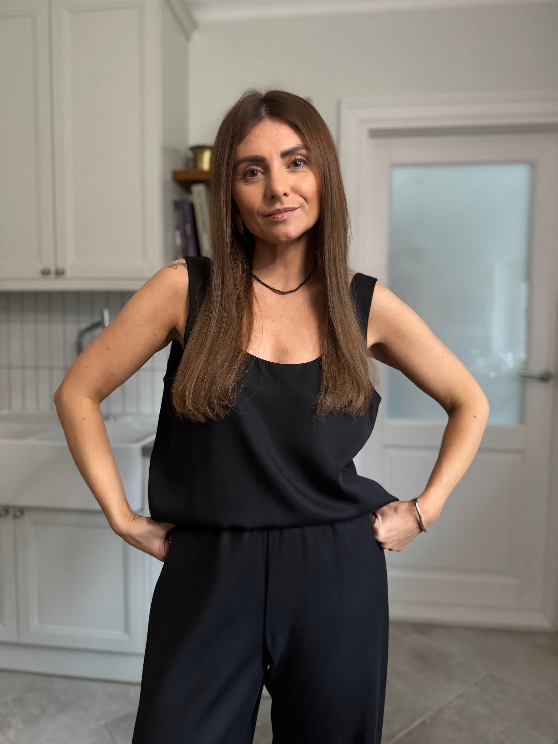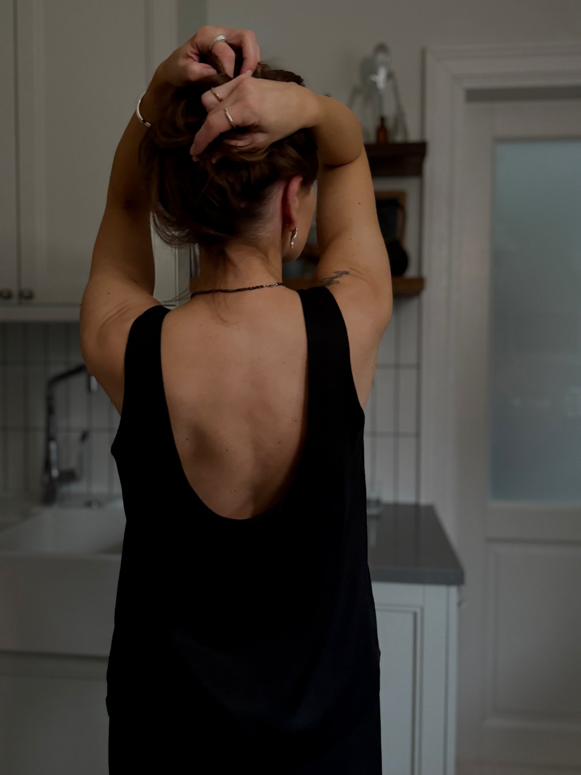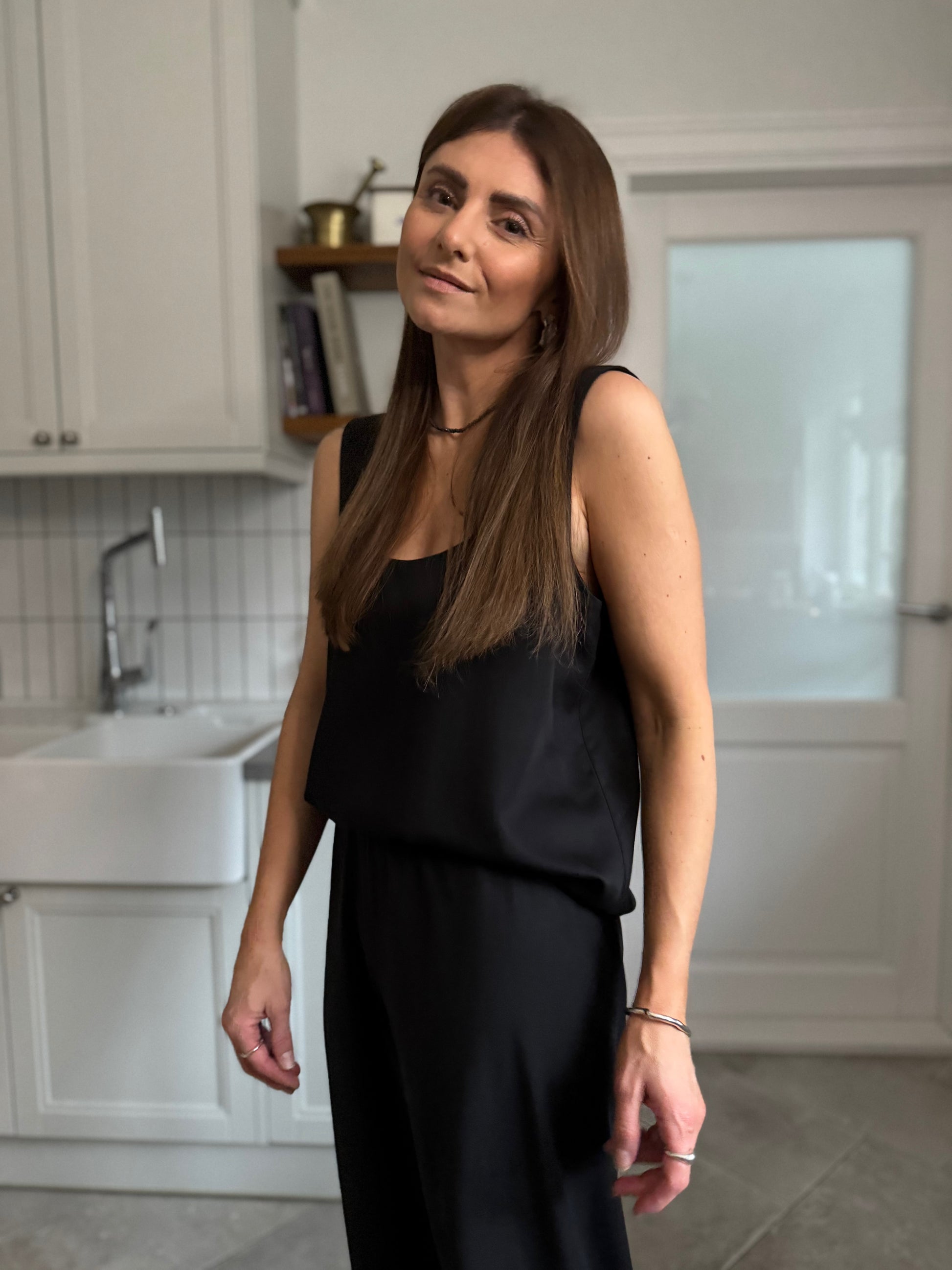 a clean cut scoop neck top with relaxed silhouette. an unquestionable staple for a minimalist capsule wardrobe. cut in black satin lyocell which with its modest sheen is a beautiful balance between satin and lyocell.