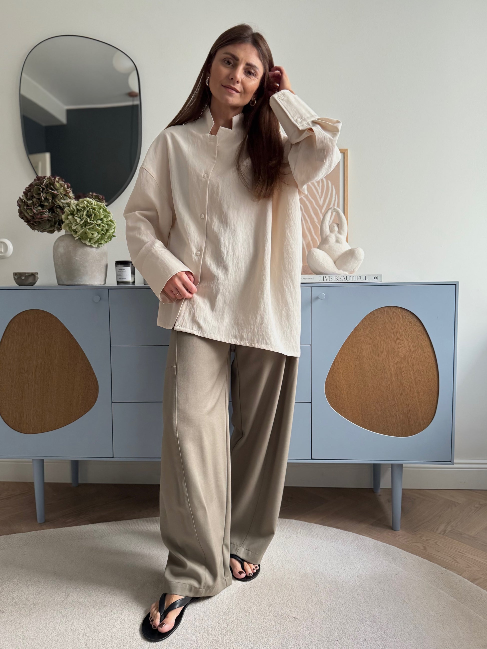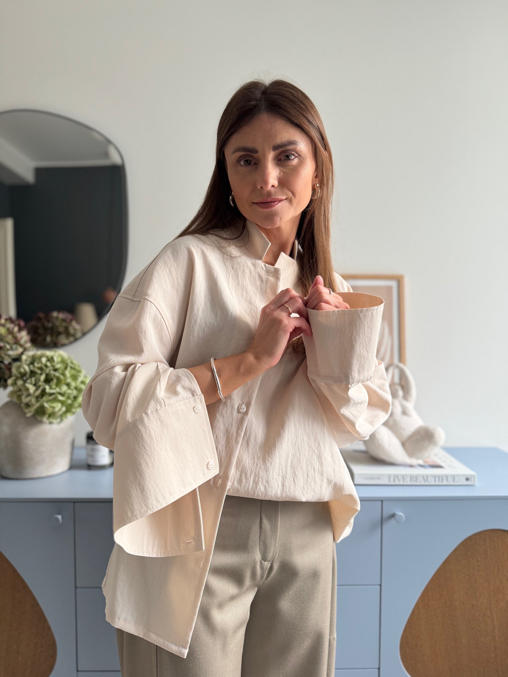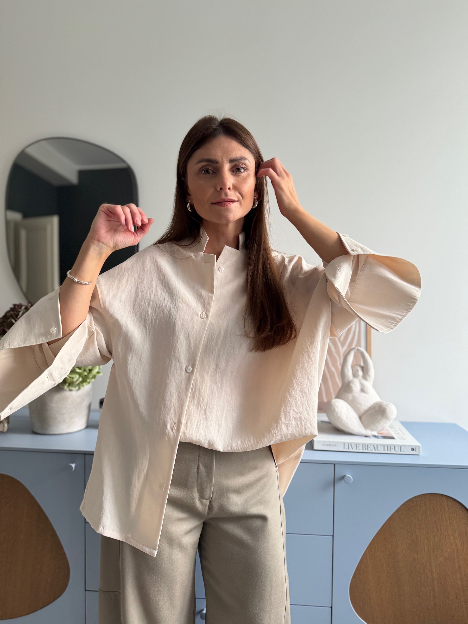 harajuku asymmetric lyocell button down features a stand-up collar, long sleeves finished with wide cuffs and a button front fastening. this might easily become your summer favorite as it conveniently works as both: a shirt and a light jacket. our tip is to wear cuffs unbuttoned and embrace unexpected kimono feels.