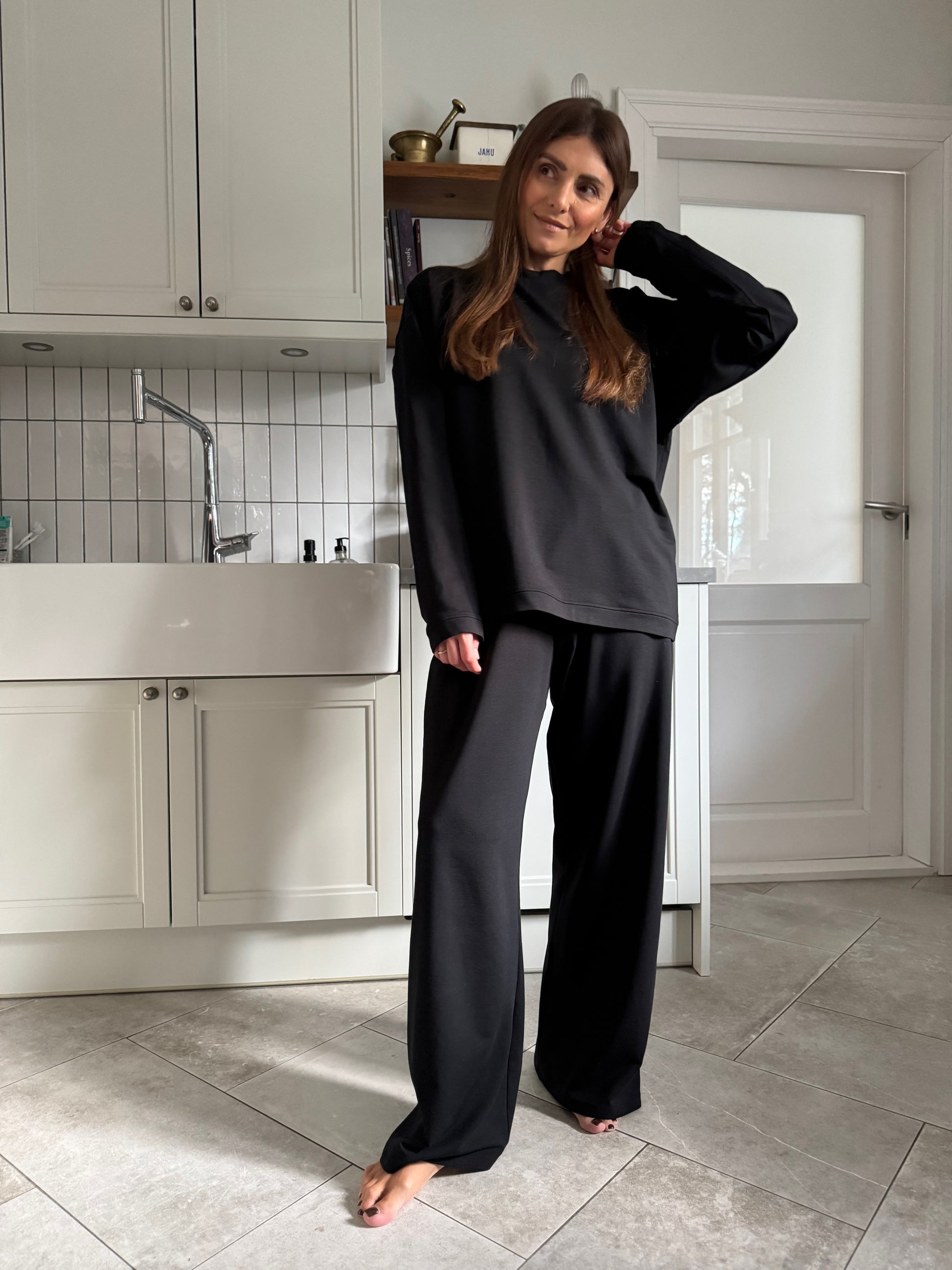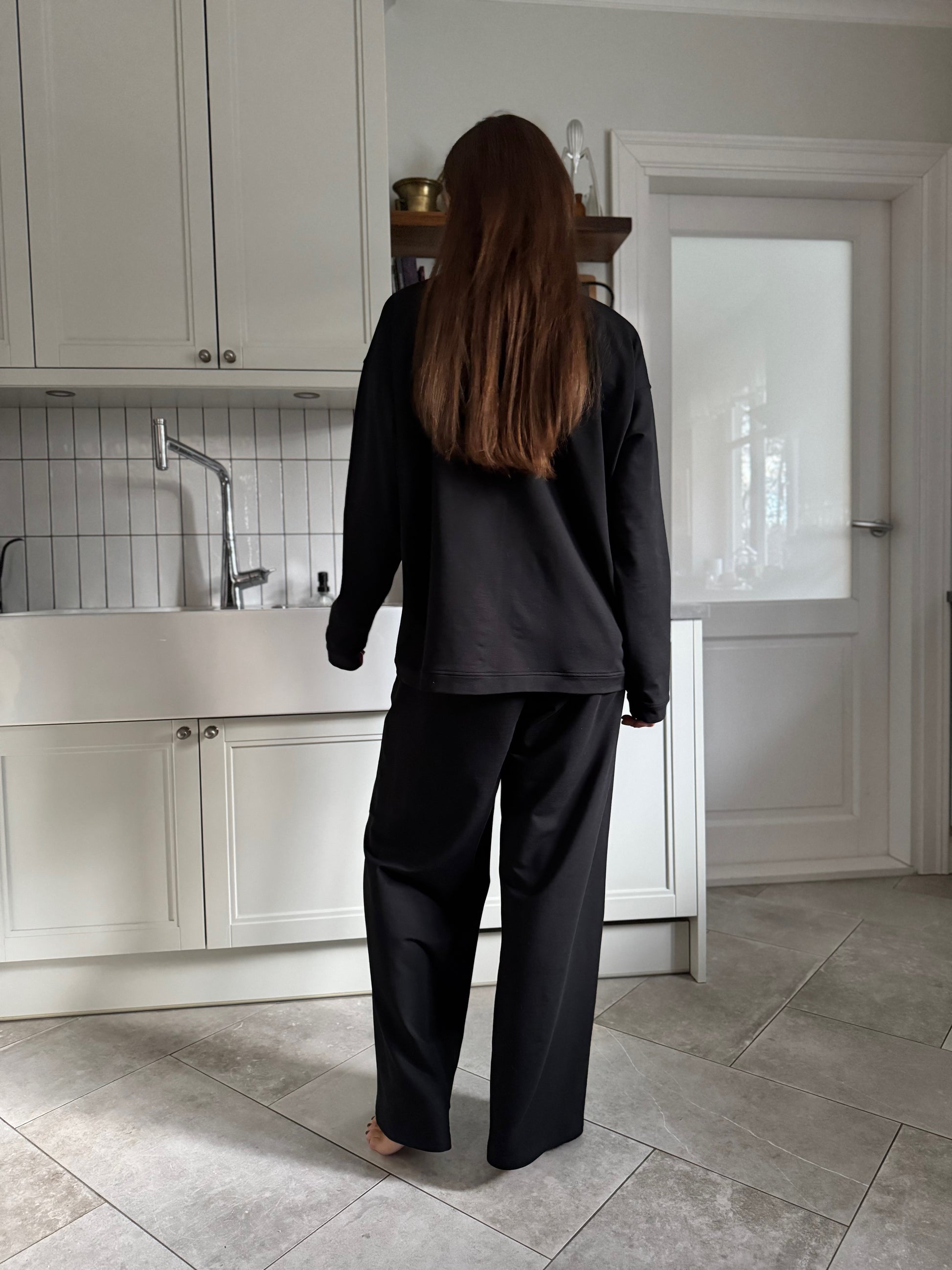 standard front length is 65 cm but we can alter the length to your needs. add a note about your desired length on the cart page when checking out. made from black bamboo french terry. the model is wearing size S.