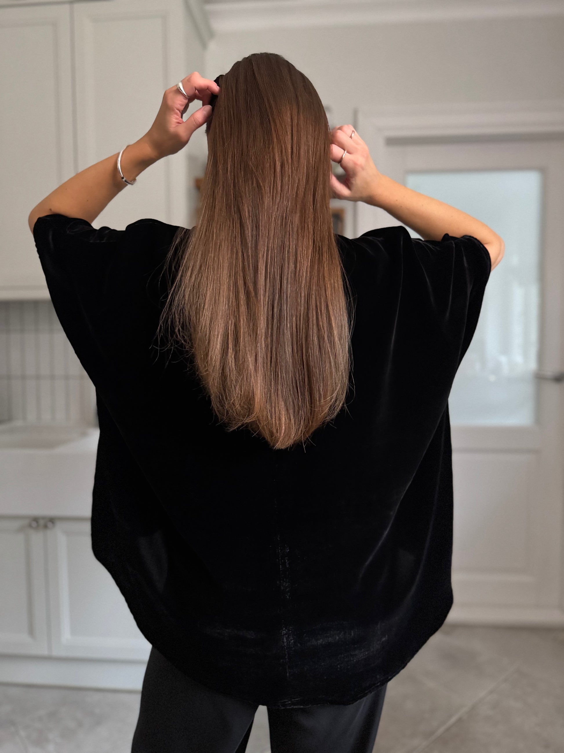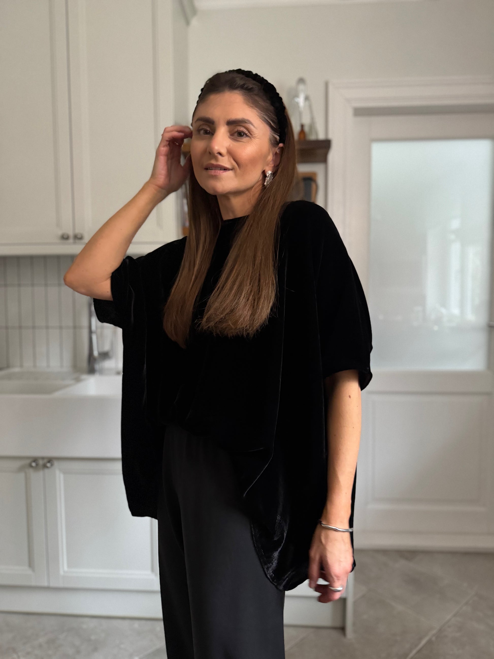 oversized superwide flowy blouse with clean lines gives effortless luxury like no other. enjoy its cape-like movement and timeless silhouette that always works. cut in luxurious silk raven black velvet.
