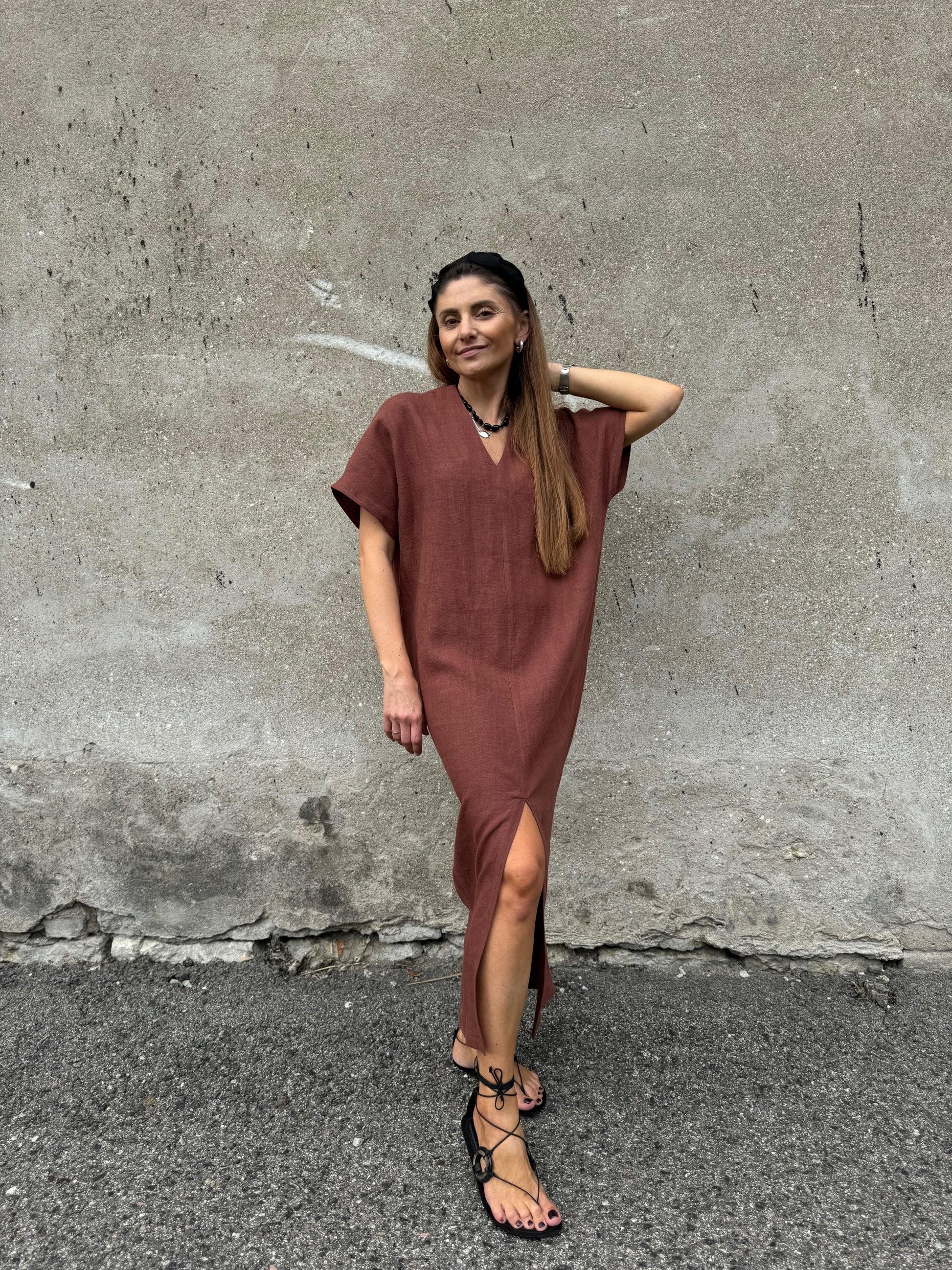 saint-tropez is a long linen dress with deep V neckline and slit in the front. combination of its chic design and washed linen fabric will take you through summer days with effortless elegance.