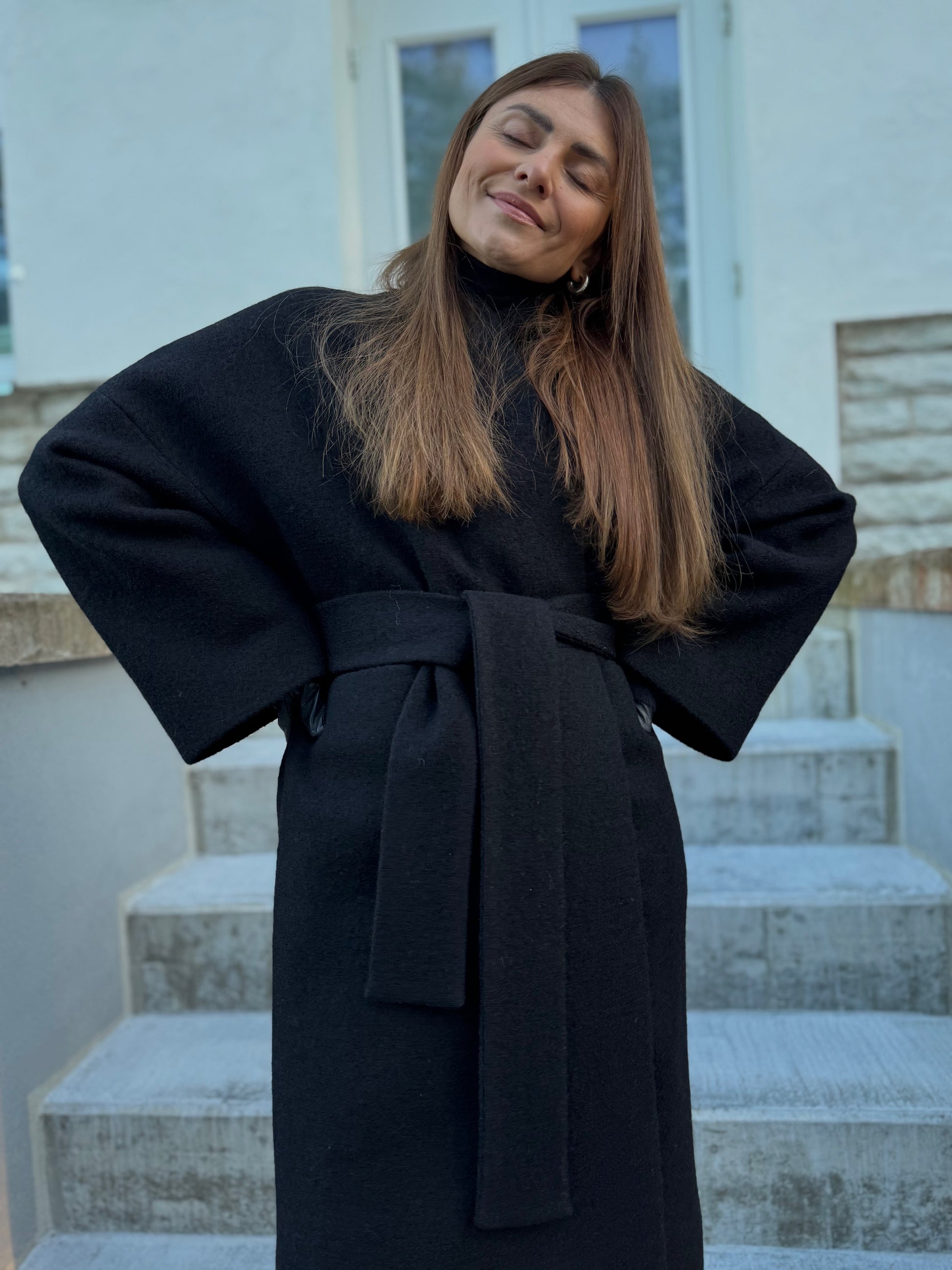 sapporo coat has a silhouette inspired by traditional japanese garment kimono: it has oversized boxy sleeves and generous body that you can alter by gathering it to your own liking. pockets in side seams.