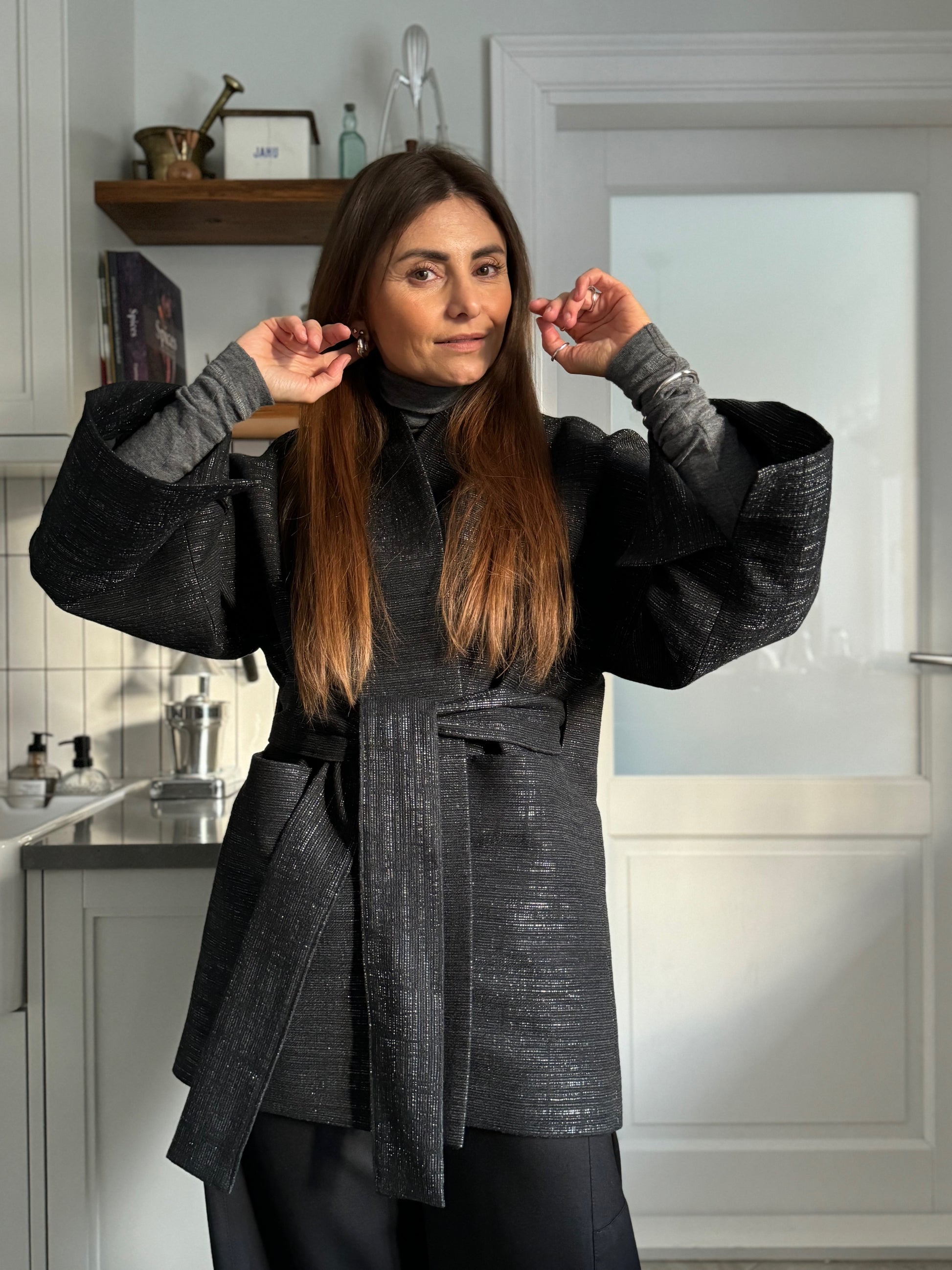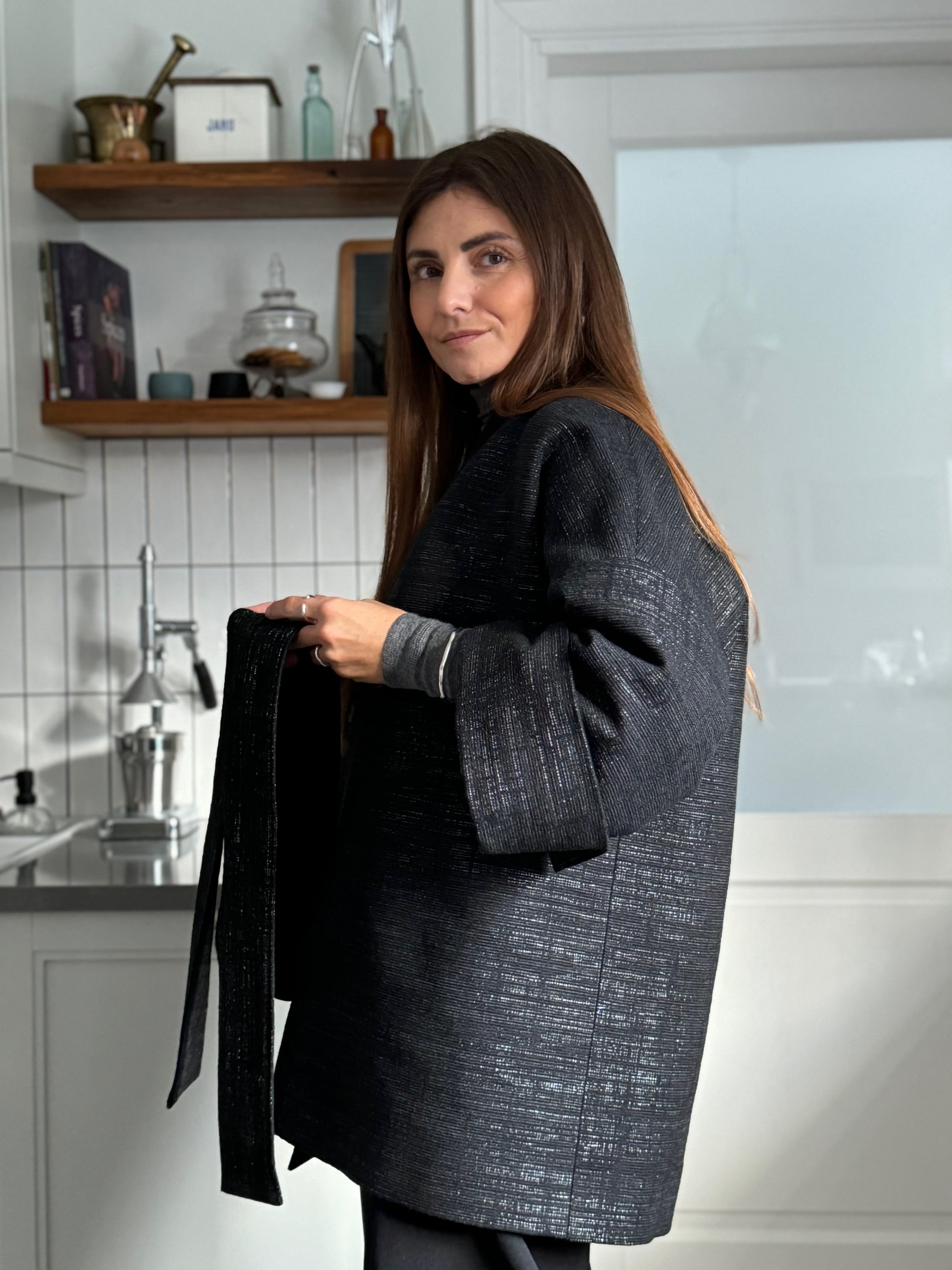 tokyo jacket has a silhouette inspired by traditional japanese garment kimono: it has oversized boxy sleeves with slits at the ends. tokyo has a generous body that you can alter by gathering it to your own liking.